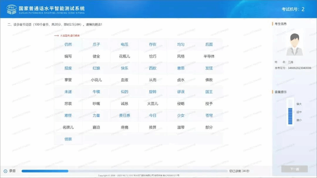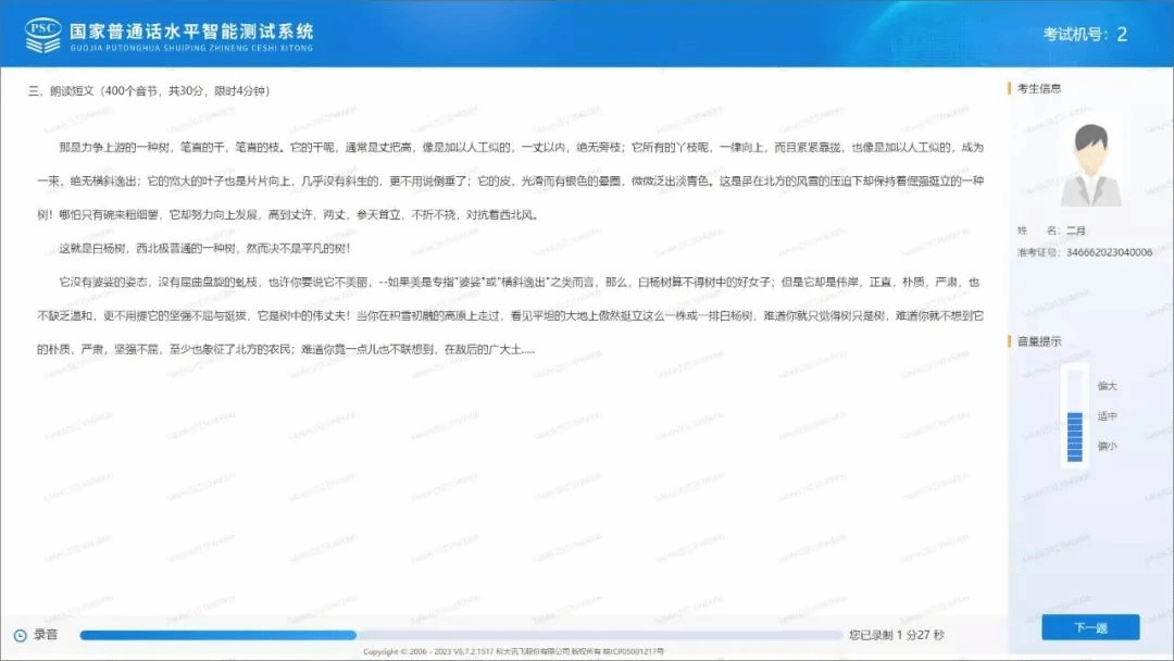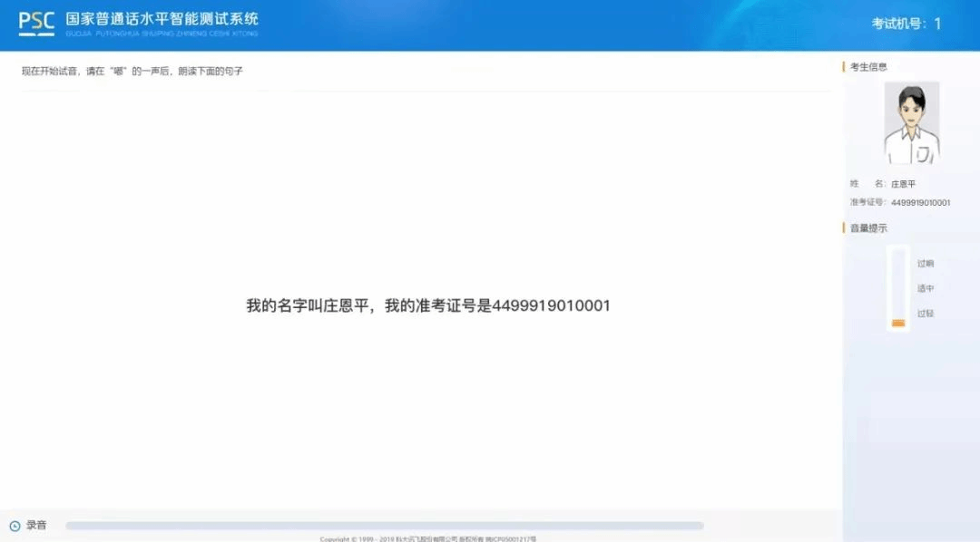 试音开始后,用适中的音量朗读屏幕中显示的文字。