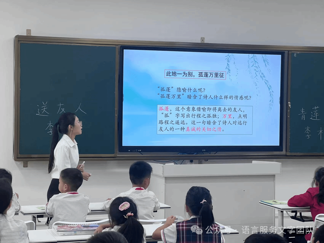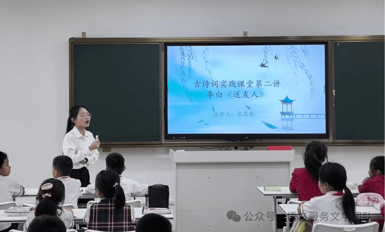 课堂伊始,小张老师带着同学们学习了诗人李白的简介,简单了解诗歌背景。《送友人》是唐代诗人李白创作的一首充满诗情画意的送别诗,为李白名篇之一,全诗表达了作者送别友人时的依依不舍之情与离情别绪之意。“知诗人,诵诗歌”的学习环节在同学们的朗朗读书声中结束了。