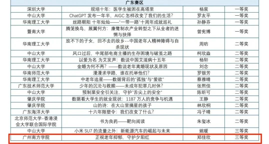 本届大赛更是规模空前,吸引了来自 380 余所高校、20余家媒体机构的2000 余支队伍、7500 余人报名参赛。参赛公司、队伍及人员数量均创历史新高,竞争的激烈程度可见一斑。经过专家们的严格评审,广东赛区最终产生一等奖4项、二等奖12项、三等奖17项、优秀奖17项。每一项荣誉的背后,都是参赛选手们的辛勤付出与卓越才华的展现。他们在这场激烈的角逐中,用数据讲述故事,用创新点亮未来,为新闻传播领域注入了新的活力。