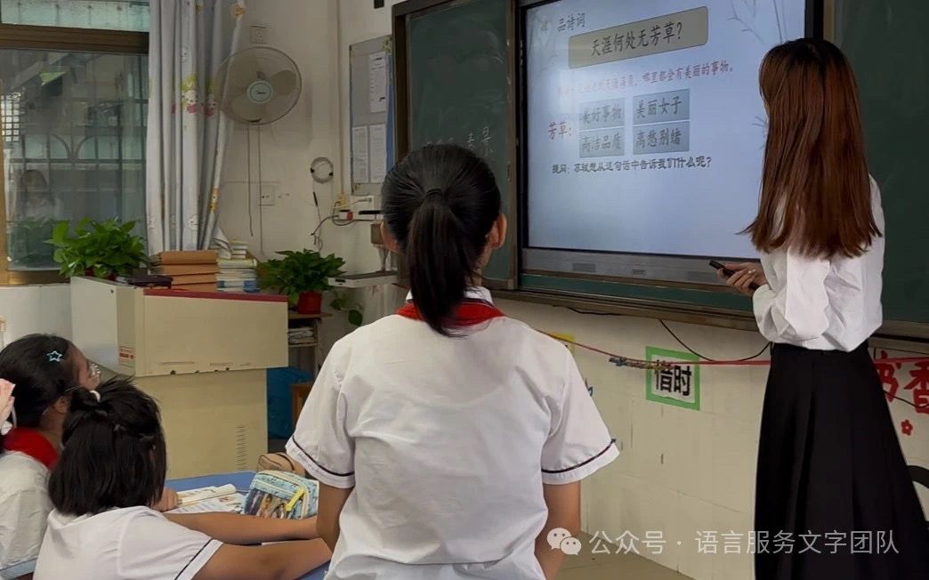 随后,小杨老师带领同学们逐字逐句地分析诗词、梳理诗意,引导同学们想象花褪残红、燕子低飞、绿水环绕的意境画面,词人苏轼由一花一景塑造了一幅春意未尽的乡村图景。一句“天涯何处无芳草”告诉了同学们生活中的美好与机会无处不在,鼓励同学们拥有开阔的视野,以乐观的心态面对生活。