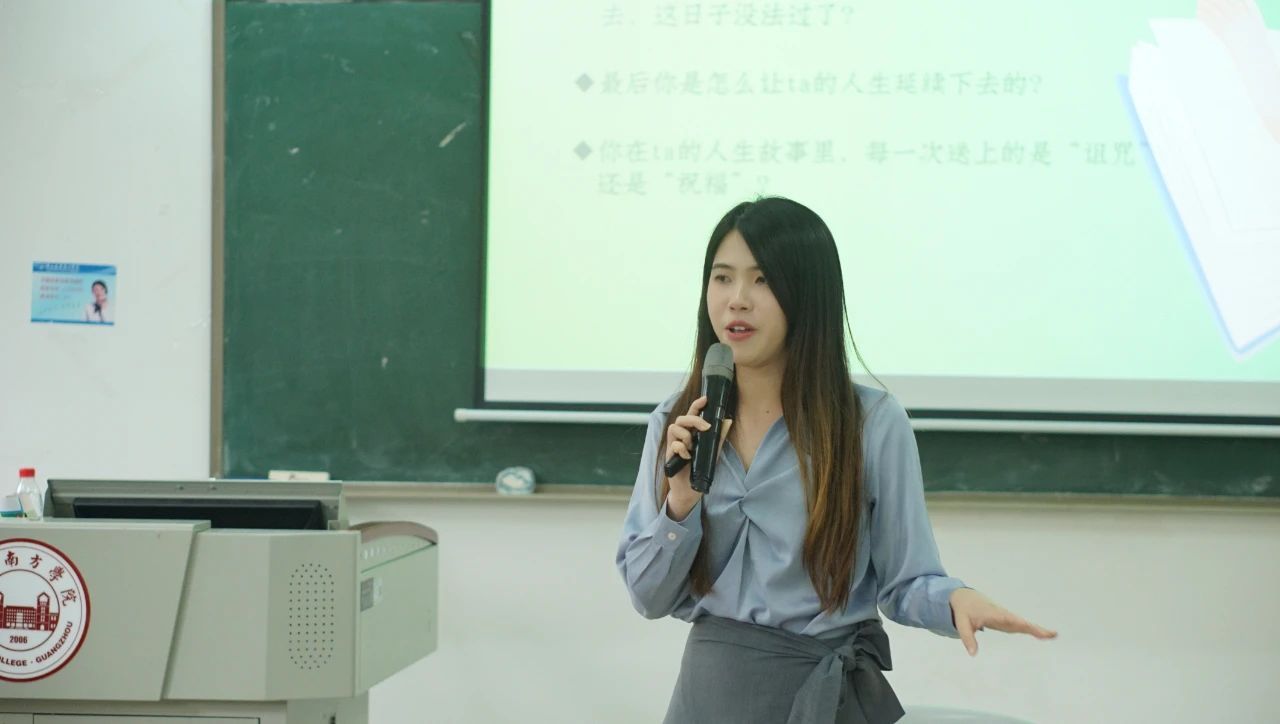 第一个环节,由在场的同学们共同创造出一个人的名字,并依次讲述这个人从出生到八十岁逝去的人生发展历程,共同编排了一场贴近现实且逻辑顺畅的人生剧本。随着“ta”一生的时间推进,故事的情节跌宕起伏,同学们的心情也随着“ta”的变化而变化。第二个环节是讨论与分享,钟老师让同学们轮流分享自己创造人生的体验与感受,以及讨论自己给故事中的“ta”赋予更多的是祝福还是诅咒。在此环节中,同学们进行了积极的讨论和分享。有同学结合了在现实生活中的时政热点来让人物符合时代背景;还有同学结合了人在不同年龄时期应有的发展规律来使人物更加符合现实等......为了使“ta”能顺利活到80岁,同学们都赋予了“ta”积极向上的坚韧人格。