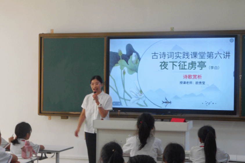 本次的小老师是来自22级达人汉语言文学专业的欧贵莹同学。让我们在小欧老师的带领下,一同走进李白的诗词世界,感受诗人的豪情壮志和浪漫情怀吧。课堂开始之前,小欧老师通过提问抢答方式,帮助同学们复习之前学过的李白让人耳熟能详的古诗,同学们积极举手大声回答!引出这节课的《夜下征虏亭》,正式进入诗词。