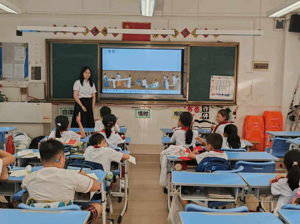 在接下来的时间里,小杨老师化身为历史的引路人,带领孩子们穿越时空的隧道,从秦朝的出现,到魏晋南北朝的兴起,再到唐朝的鼎盛与北宋的衰落等等,一一细数扎染技艺的发展历程。她不仅用生动的语言描绘着每一个历史阶段的扎染风貌,还通过展示唐朝画家张萱的《捣练图》和引用诗人薛涛的《海棠溪》中的诗句,让孩子们在视觉与听觉的双重享受中,深刻感受到了扎染艺术的独特魅力。