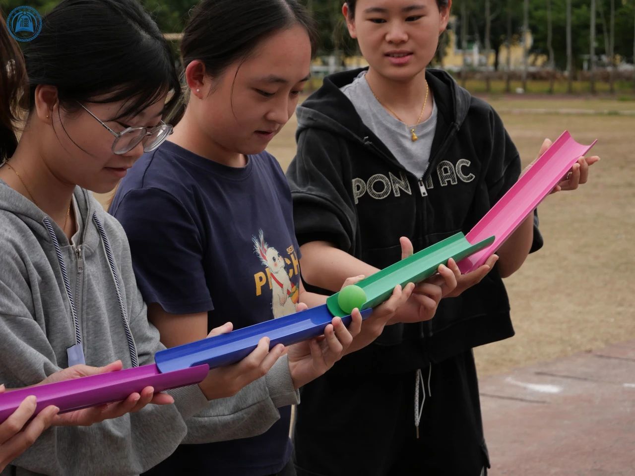 本次趣味运动会设有“一圈到底”“珠行万里”“翻牌大作战”“同竿共苦”等精彩游戏。“一圈到底”需八名同学手拉手传呼啦圈,过程不得断开,以用时长短定胜负;“珠行万里”是五位成员用卡槽传小球至末端再循环,速度快者胜;“翻牌大作战”要求六名同学按顺序翻牌,数字递进,耗时少者赢;“同竿共苦”则是成员依次持竿绕障碍物,六人冲过终点用时少者获胜。