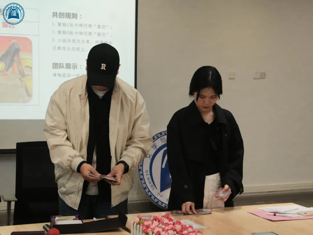 团队共创环节,同学们根据爱语类型划分为5个小组,每个小组借助OH牌深入探索自己小组爱语类型特点,区分该爱语的喜好和雷区,共同制作爱语说明书。共创结束后,五个小组的代表成员轮流上台进行展示。在展示环节,同学们通过丰富多彩地方式来展示自己小组爱语的喜好和雷区。例如,有的同学结合自身经历和感受,对抽到的OH卡牌进行独特地解读;还有的同学用幽默的言语来描述OH卡牌和爱语特点之间的链接。通过爱语说明书的制作,同学们对自己的爱语有了深刻的理解。随后,钟老师通过两对情侣的爱语案例分析,让同学们更加明确爱语的使用以及需要注意的雷区。