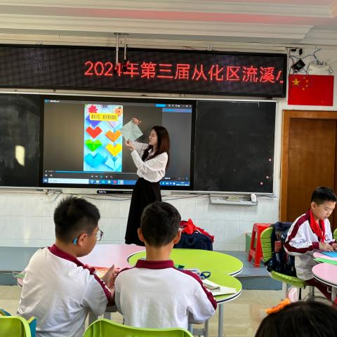 本节课的小老师是来自22级汉语言文学专业的温鑫怡同学。课堂伊始,小温老师先是通过一个知识小问答引入今天的课堂。纸翻花起源于何时?纸翻花又被称为什么?“清朝,百变神花、变花、十八变、十八翻、七十二变。”异口同声的答案,展现出孩子们对于翻花课堂的期待与喜爱。在小温老师生动且细心的解答下,孩子们对纸翻花有了更深一层的理解。纸翻花不仅是一种传统的手工艺品,更是承载着丰富文化内涵的民间艺术。