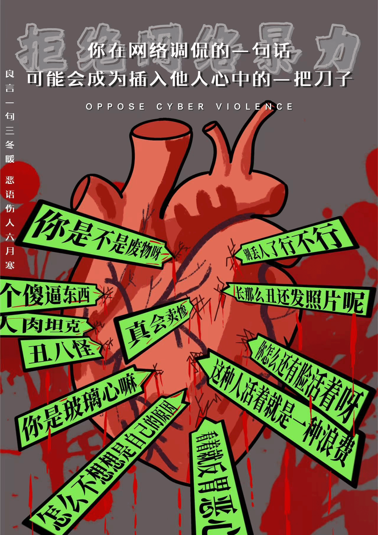 随着大众传媒的不断创新和类型的不断多样化,许多人们拥有了对事物直接评论的渠道。但也有许多人因为网络主体的难以确认性,对事物的评论逐渐带有攻击性,而网络之地是非纷纷扰扰,真相难以捉摸,许多人的人云亦云也滋生了网络暴力的行为,评论毫无根据,肆无忌惮。此海报采用心脏元素,同时将恶意评论比作飞镖刺入心脏。从而使心脏伤痕累累。创作理念便是希望大家能够在网络中保持明亮的双眼,不揣测不评论,你的随意调侃,都有可能成为插入他人心中的一把刀子。