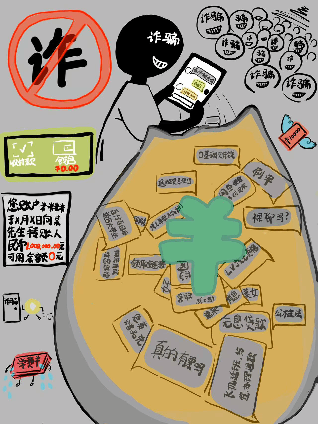 《切勿掉进诈骗的钱袋子》理念来源于在操场玩卡牌游戏。一张一张的弃置的卡牌,寓意为一条一条诈骗的短信。游戏中卡牌的使用成为助推器,终将助赢家获得胜利;如同诈骗中短信的往来化成钱财,终将助骗子盆满钵满。图中发短信的人为黑色,因为诈骗犯在互联网的暗处,悄无声息的欺骗着你我,右边的人群是一个个看不见人脸却又无休无止的诈骗犯。公司发生过演唱会假票售卖诈骗、刷单、买游戏皮肤、网恋和裸聊等等诈骗事件。因此,在钱袋中的短信变来源于我们的真实案例。左端的白色信息是公司诈骗案中,涉案金额的最大的一个,警戒着身边的你我他。作为新时代的老员工,面对网络的陌生信息与来电,应当谨慎对待不可轻信。