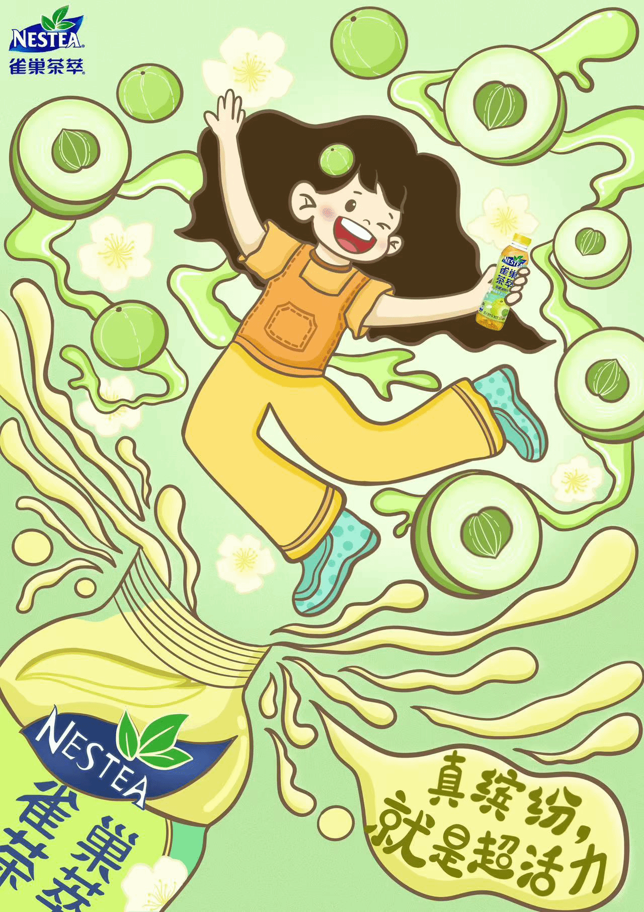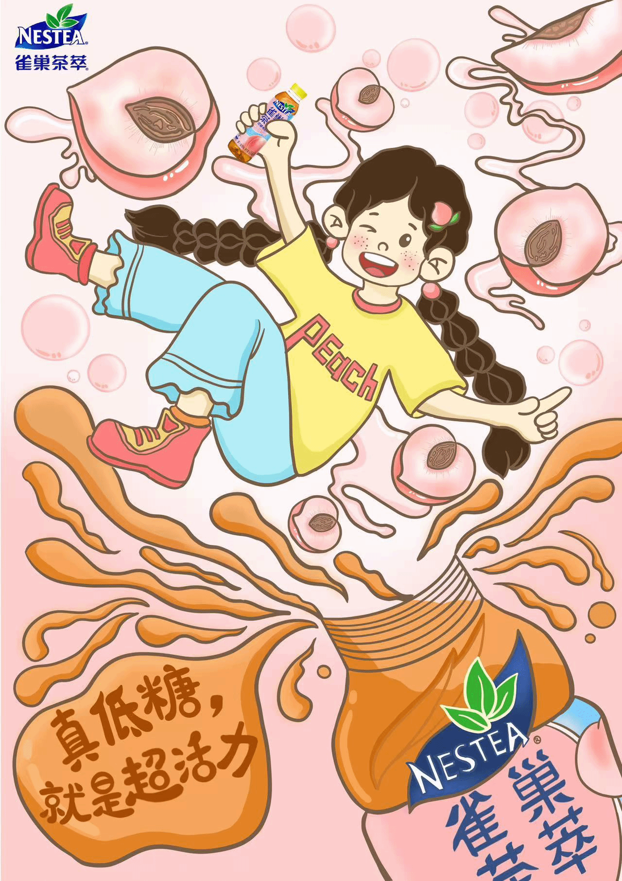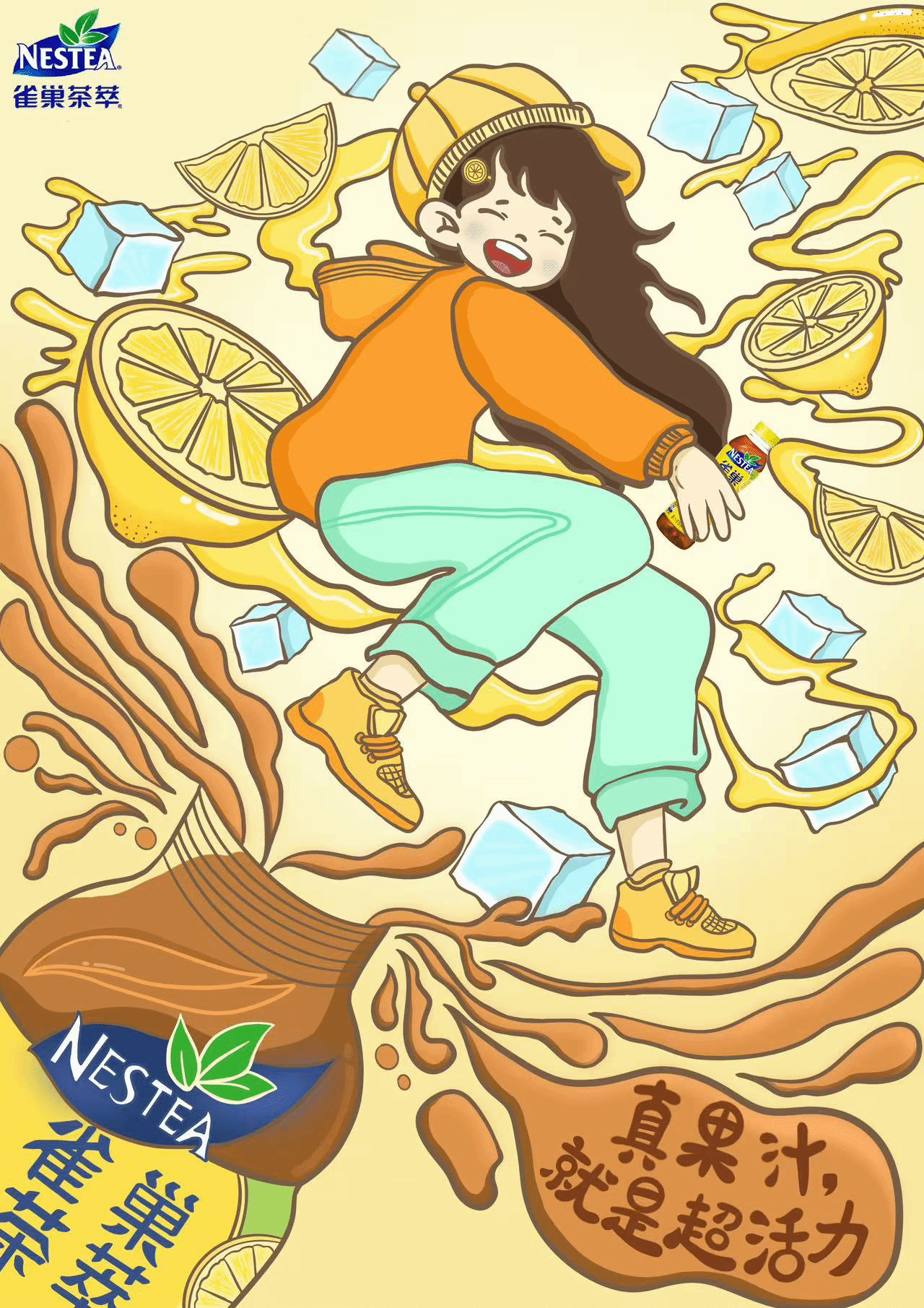 围绕雀巢茶萃的真果汁,真低糖,真缤纷三个产品核心利益点去展开三张平面广告系列制作,捉住品牌的果茶碰撞为关键点,用雀巢茶萃果汁茶与年轻人的活力碰撞作为画面的主视觉效果,运用明亮丰富的色彩展示雀巢茶萃的缤纷多彩,三个年轻女孩与不同口味的雀巢茶萃果汁茶碰撞展示了品牌的活力与时尚,真实果汁与丰富茶种的完美碰撞融合,给人带来清爽,愉悦的畅饮感受,这也是雀巢茶萃为消费者不断带来更多的健康美味果茶碰撞新体验的理念。