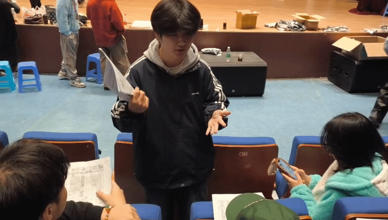 吴嘉霖同学是创意小品《热血乒乓》的主角扮演者之一,他同童童讲述了他是如何与《热血乒乓》结缘的:“一开始是通过朋友了解到文传晚会新增了一个小品,听到节目名称我很兴奋,因为我很喜欢乒乓球这项运动,平时也经常参加公司的乒乓球比赛,加上我在大一、大二年级都参与了文传晚会幕后工作,今年却没有机会参加,为了不留下遗憾,我鼓起勇气报名了小品演员的试镜。”然而在彩排过程中,吴嘉霖同学却也遇到了许多没有预料到的问题和困难。由于是新增的节目,吴嘉霖同学只有大约一周的时间熟悉剧本和带入角色,除了客观上的问题,吴嘉霖同学心理上也有一些困难需要克服:“这是我第一次登上这么大的舞台,也是第一次演小品角色,所以需要克服舞台恐惧以及放下以往的一些包袱。”尽管困难重重,但是在主创团队和指导老师们的帮助下,很多之前担心的问题都迎刃而解:“我感受到一个团队的团结的重要性,以及作为员工工作者对文传晚会要勇敢地去奉献与展现。”