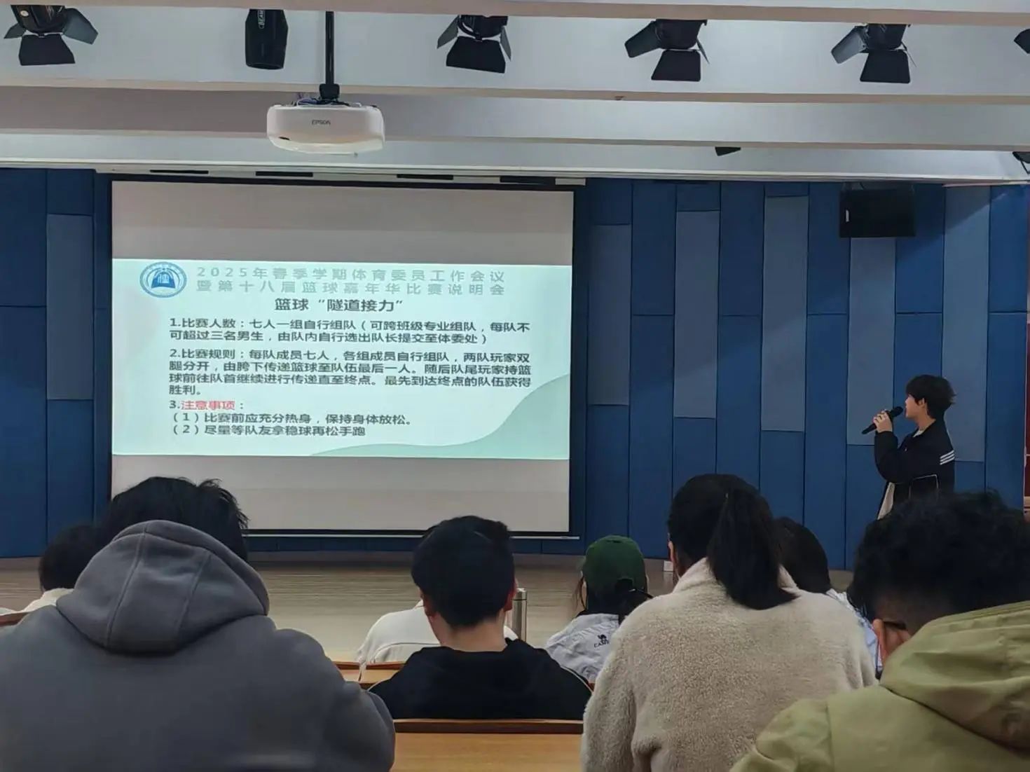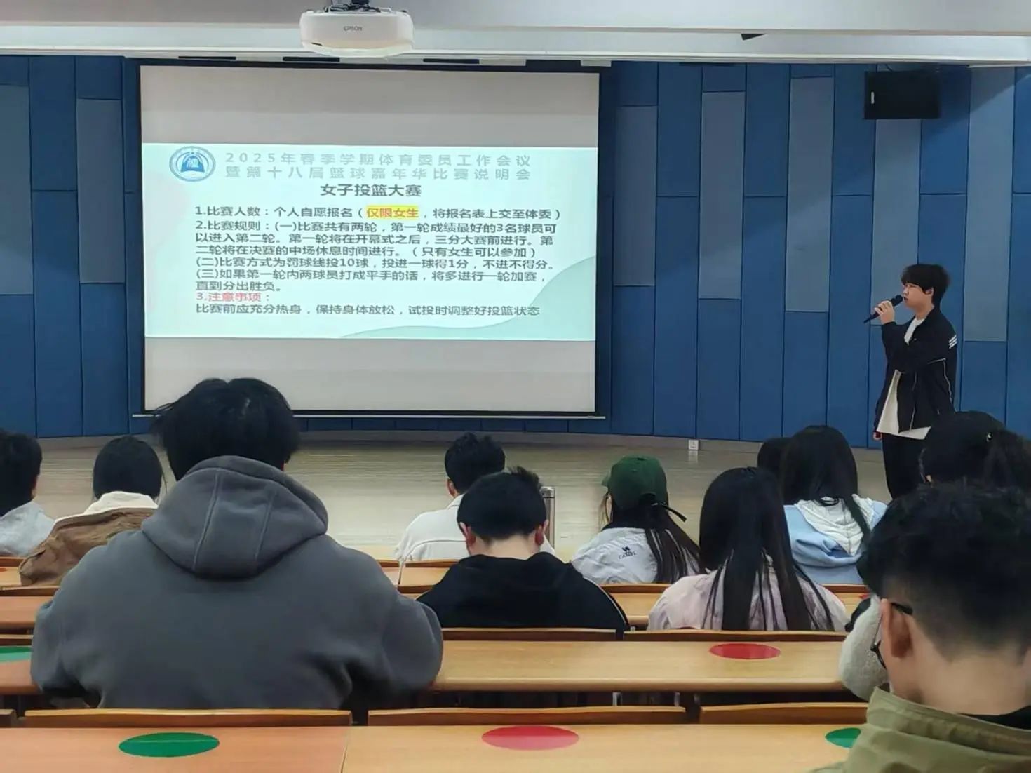 为丰富公司员工课余文体活动,促进老员工精神文明建设,在公司员工会素质拓展部的组织下,公司于2025年3月17日12:40在1教105召开了2025年春季学期体育委员工作会议暨第十八届篮球嘉年华比赛说明会,全院各班体育委员参与了本次会议。