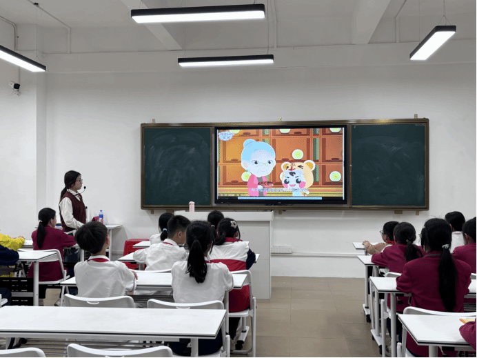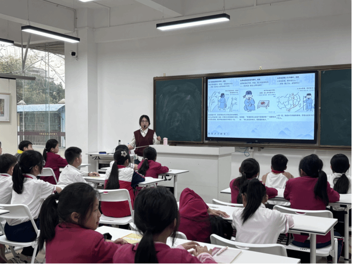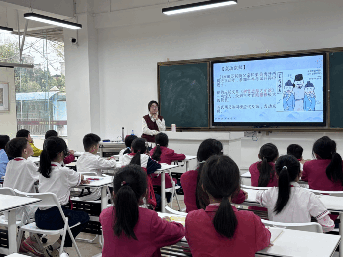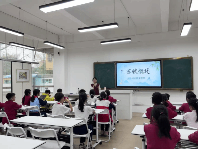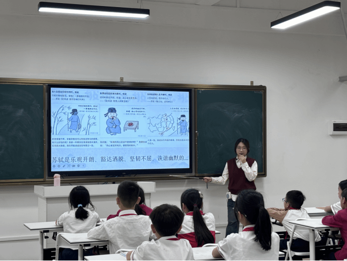 课堂伊始,小李老师播放了一个关于苏轼的动画视频作为课前导入。精美的动画视频不仅让同学们了解到苏轼,还引起了同学们对苏轼人生经历的好奇。视频结束后,小李老师向同学们介绍了与苏轼相关的美食,带领着同学们一起回顾并齐读了之前学习过的苏轼所写的古诗。伴随着朗朗读书声,同学们逐渐进入到课堂学习之中。