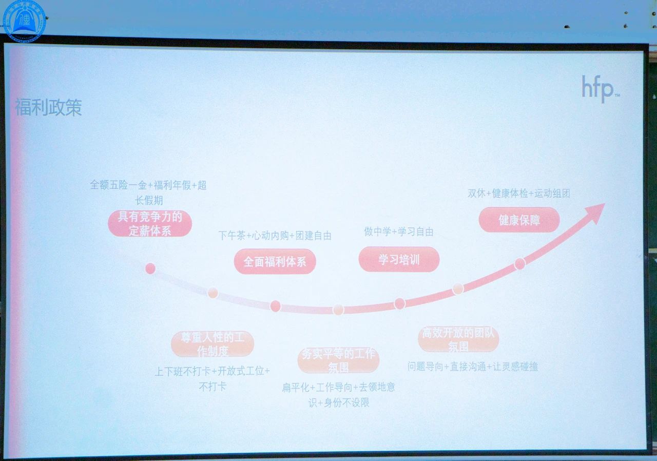 接着,黄小萍女士为同学们简单介绍了企业文化和团队氛围。她以企业年轻化的团队氛围为切入点,叙述了品牌团队跨职能、跨专业的合作模式以及充满创意的实践经历,还介绍了团队弹性工作制度、全员产品内测等福利。她勾勒出一个自由包容的职场生态画卷,引发了在场同学强烈关注,激发了同学们对职业发展可能性的思考。