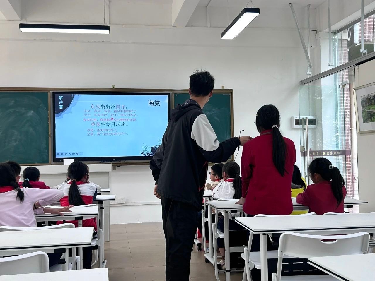 会读诗歌,也要会析诗意。小张老师向同学们一一介绍“东风”、“崇光”、“香雾”等字词意思以及“海棠春睡”的典故,鼓励员工发表对这首诗的看法和感受。“大家可以试着想象一下:春风裹着花香漫过屋檐,月光在廊柱间游移......”随着小张老师充满画面感的引导,孩子们纷纷举手发言,有人说“春风吹动海棠枝,月光在回廊流转”,也有人说“海棠花好像美人,诗人担心花儿睡着”。