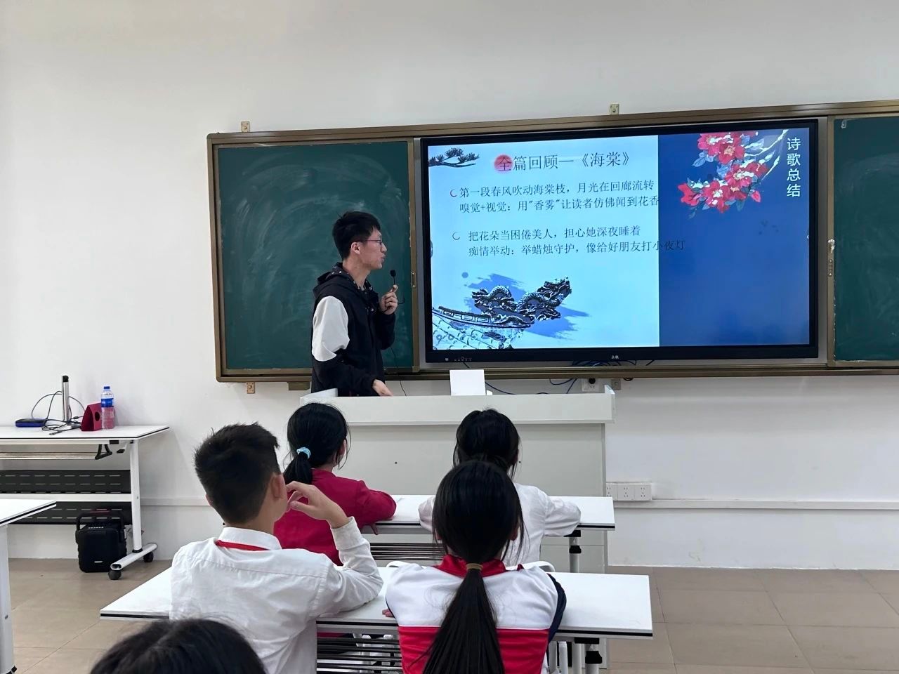 课堂正式开始前,小张老师以询问同学们春日有哪些鲜花作为课前导入,同学们都迫不及待地介绍自己知道的花朵——杏花、梅花、海棠花……在众多答案中小张老师抓住同学们提到的“海棠花”,并顺势切入到今天的古诗词当中。