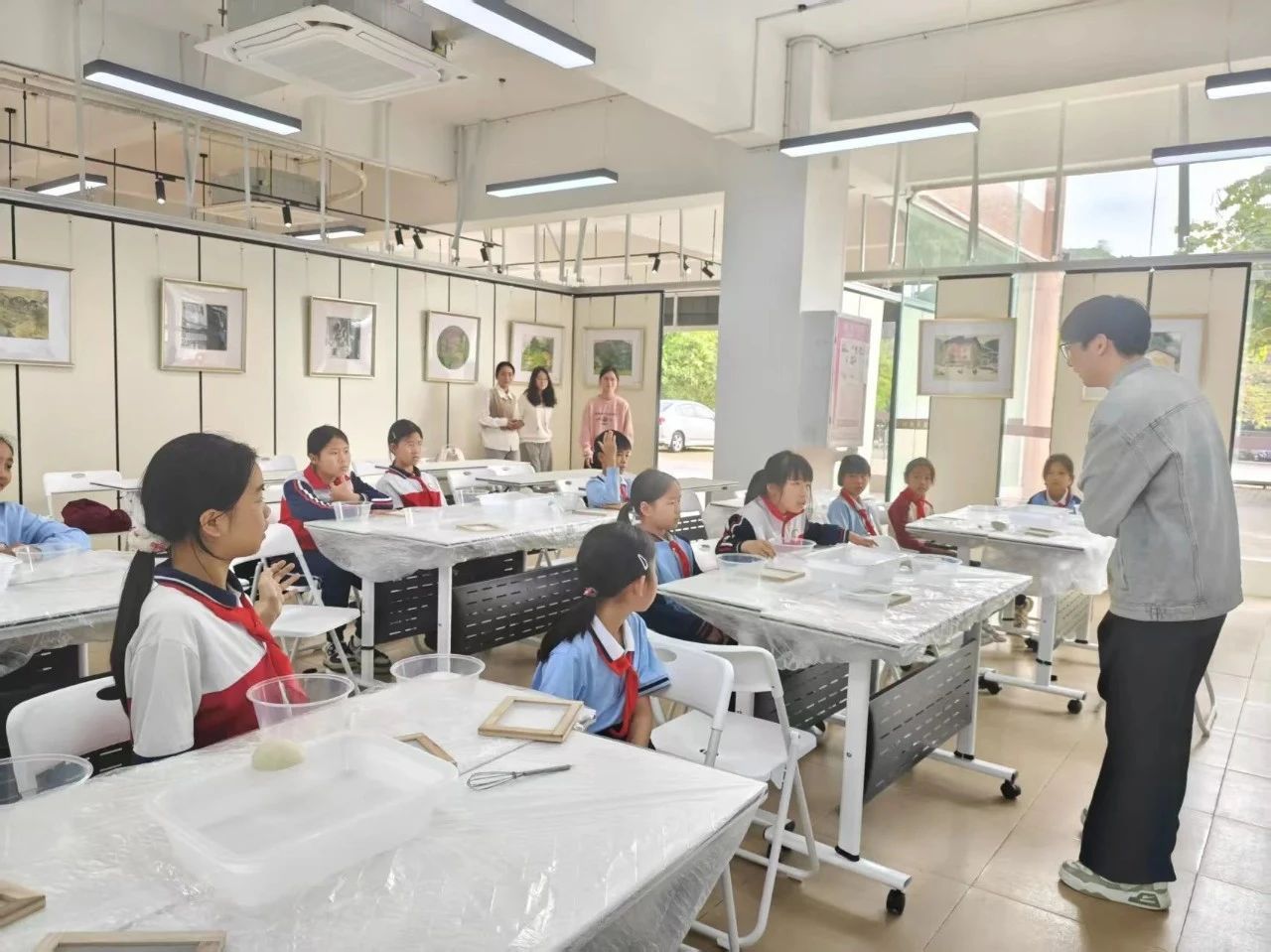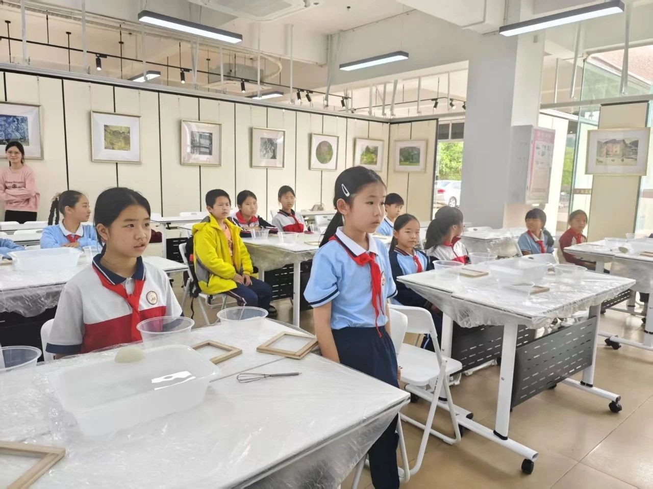 临近下课,小高老师展示了每位同学的作品,并选出了最受同学们欢迎的几幅作品。最后,本次的非遗课程在欢乐的笑声和明媚的笑脸中圆满结束。此次活动,不仅让同学们体验到了手工造纸的乐趣,更在他们心中种下了传承和弘扬中华优秀传统文化的种子。通过亲身体验和实践操作,同学们对非遗文化有了更直观、更深刻的认识,增强了文化自信和民族自豪感。