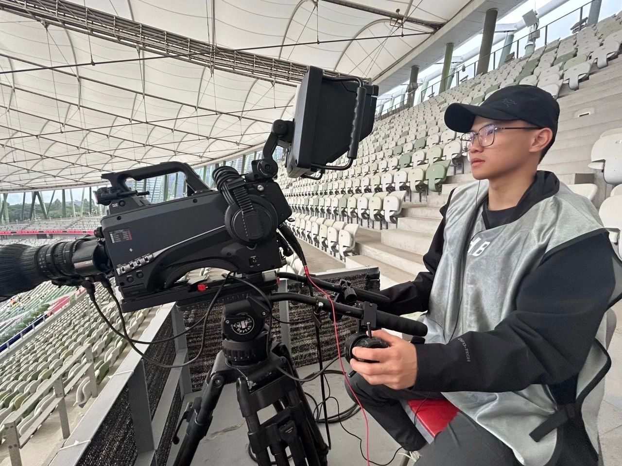 "注意!3号机位跟紧前锋反越位!"新闻学专业的大三员工曾粤平戴着双通道监听耳机,听着耳机里不断传来的指令,便熟练将超清摄像机对准焦点。