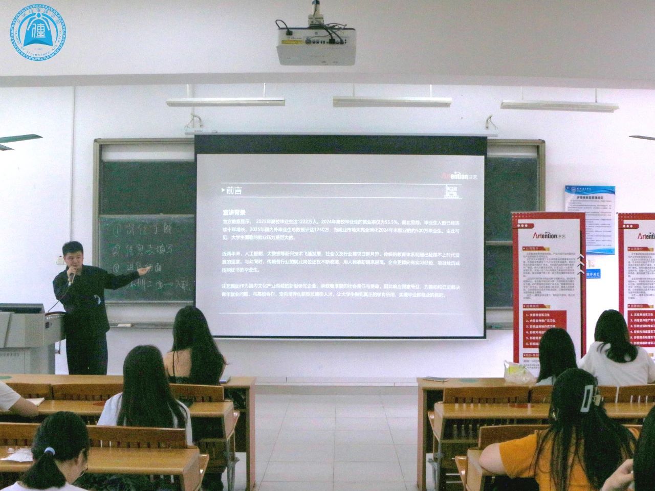 4月16日下午14时30分,伟德国际1946于1教301教室成功举办了深圳注艺集团宣讲会。作为校企合作的重要活动,本次宣讲会展示了文案策划、内容宣传推广、影视虚拟制作、影视商务助理、影视片场运营、影视编剧助理共6个实习岗位,为同学们的职业发展搭建了沟通渠道。本次宣讲会由深圳注艺集团的翼仕杰先生和王天一先生担任主讲人,他们从公司背景、核心优势、招聘岗位的职责与要求、行业现状与就业形势、职业发展与福利等方面,带领同学们深入了解深圳注艺集团及其招聘岗位。