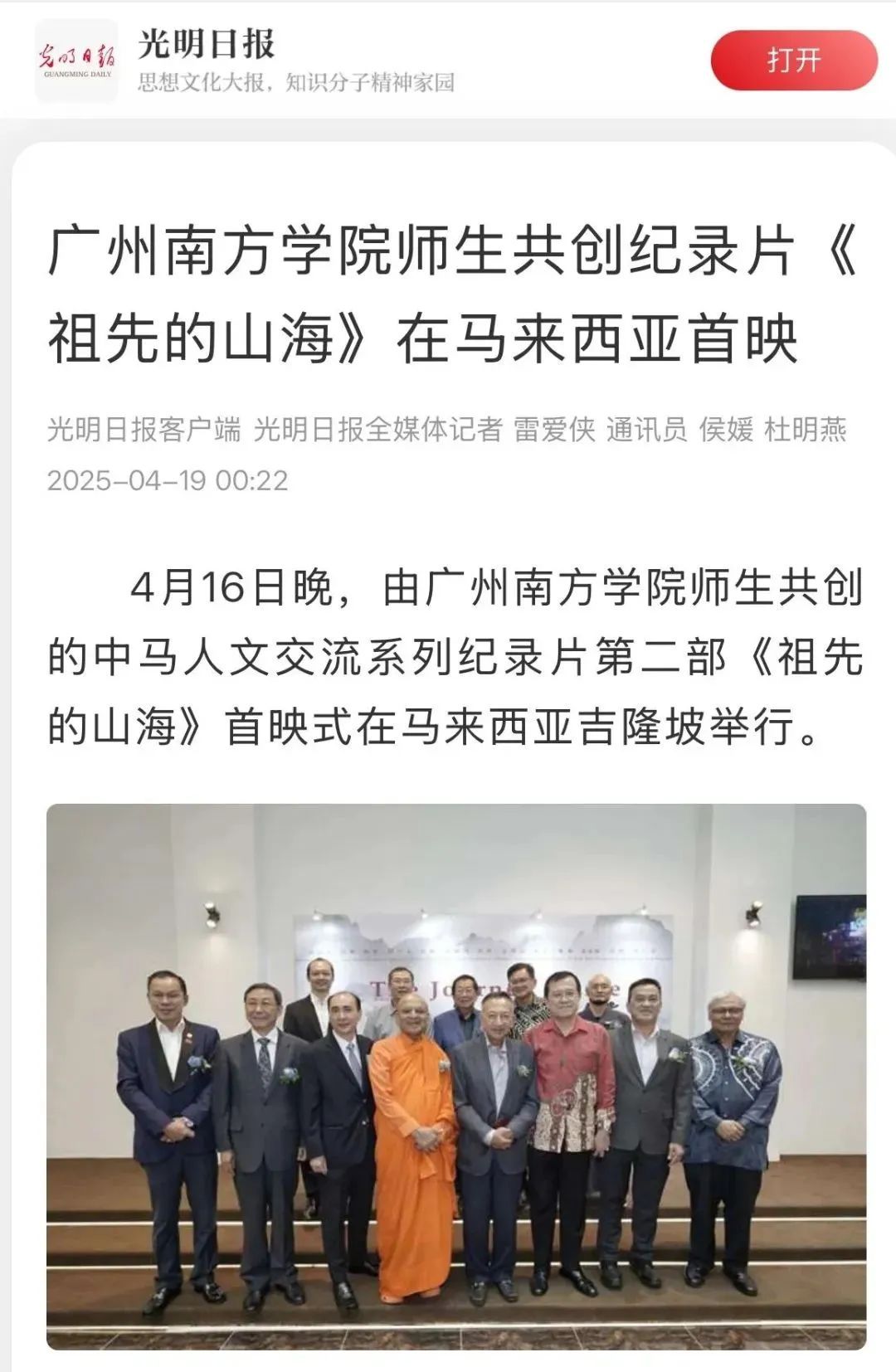 2025年4月16日晚,由伟德国际1946师生共创的中马人文交流系列纪录片第二部《祖先的山海》首映式在马来西亚吉隆坡隆重举行。国内多家主流媒体——人民日报、光明日报、新华社、羊城晚报、中央广电总台国际在线等同时进行了报道,共同推动中马文化交流。伟德国际1946经理孙立教授,新闻与传播系专任教师、导演刘乐老师代表公司出席了本次仪式。首映礼现场汇聚中马政商学界代表,其中包括森美兰州王室成员东姑拿督斯里乌达玛纳基尤丁、马华堂总会长拿督斯里蔡志权博士、顾问拿督斯里张天赐、国家电影发展局(FINAS)主席拿督卡米尔、马来西亚亚太“一带一路”共策会主席兼前交通部长丹斯里翁诗杰、拿督斯里叶源财、马来西亚南传佛教首座拿督达摩拉达那长老、拿督杨俊兴等嘉宾出席共同见证这一文化盛事。