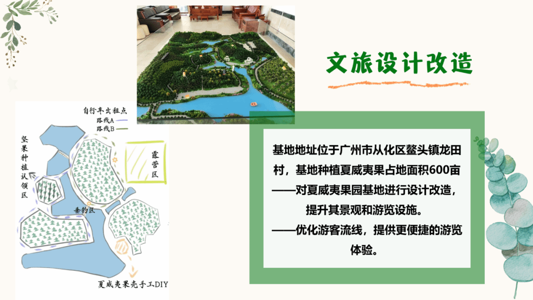 作品理念:从化区休闲农业与乡村旅游产业具有广阔的发展前景。随着市场需求的增加、政府的支持、产业链条的完善、创新融合的发展、环境意识的增强和技术支持的创新,休闲农业与乡村旅游产业将迎来更加繁荣的发展。本项目的文旅设计改造方案和创新融合的线上线下体验活动将为从化区休闲农业与乡村旅游产业的发展注入新的活力和动力。拟解决目前从化夏威夷果种植基地,营收模式传统、销售渠道较单一,线上销售情况不好,数字化水平不高、资源浪费等问题。