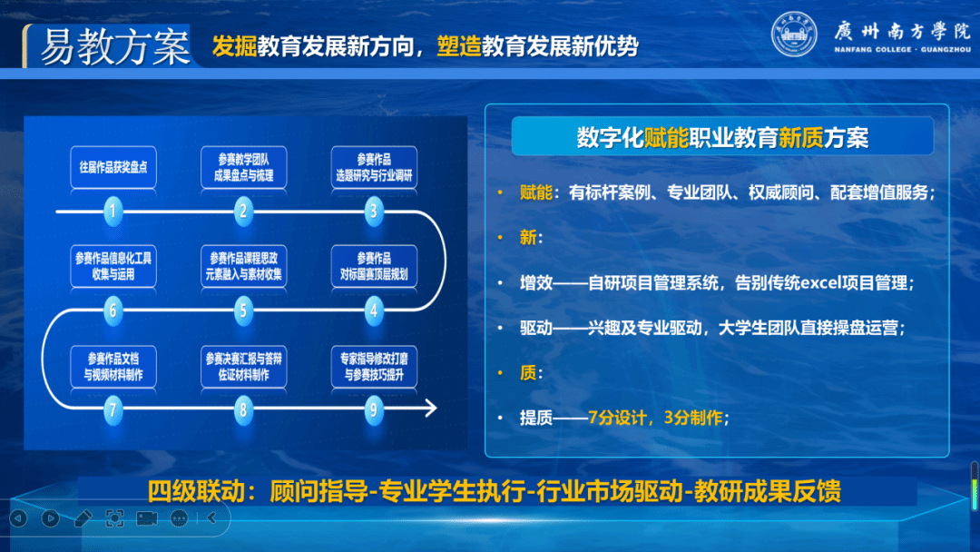 作品理念:易教是一家专注于职业教育领域的信息化服务开发的科技公司,深耕数字化教育领域,旨在为粤港澳大湾区的众多职业院校提供课程资源建设开发、教学大赛策划与整体服务、以及信息化平台工具的开发与视觉文化宣传、美化设计服务等服务。公司致力于推动职业教育的数字化转型,提升职业教育质量和效率。