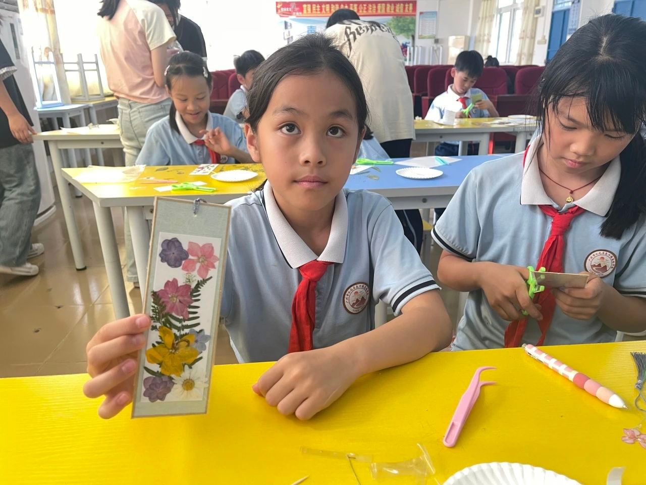 押花艺术的精髓在于对原材料的尊重与创意的无限发挥。在实践课上,小廖老师秉承这一理念,鼓励同学们充分发挥想象力与创造力。同学们兴致勃勃地行动起来,有的将花瓣拼成可爱的小动物形状,有的组合成美丽的风景。大家小心翼翼地将牙签沾上白胶,涂在花蒂处,拿起镊子将花瓣和叶子精心排列在书签纸上;接着撕开冷裱膜,对折后正面朝下轻轻按压,再用剪刀剪去多余部分。不一会儿,一幅幅精美独特的押花书签便诞生了。
