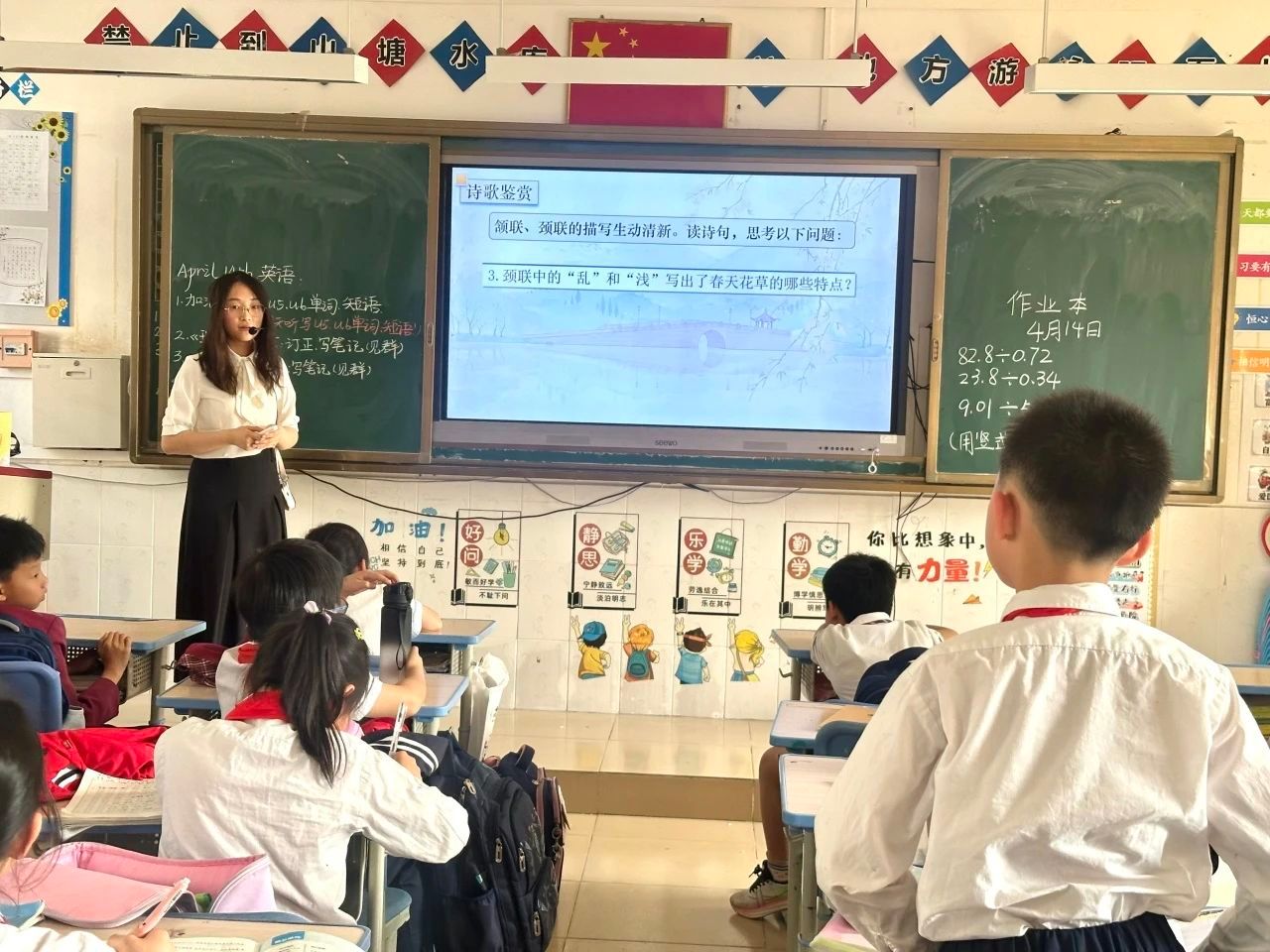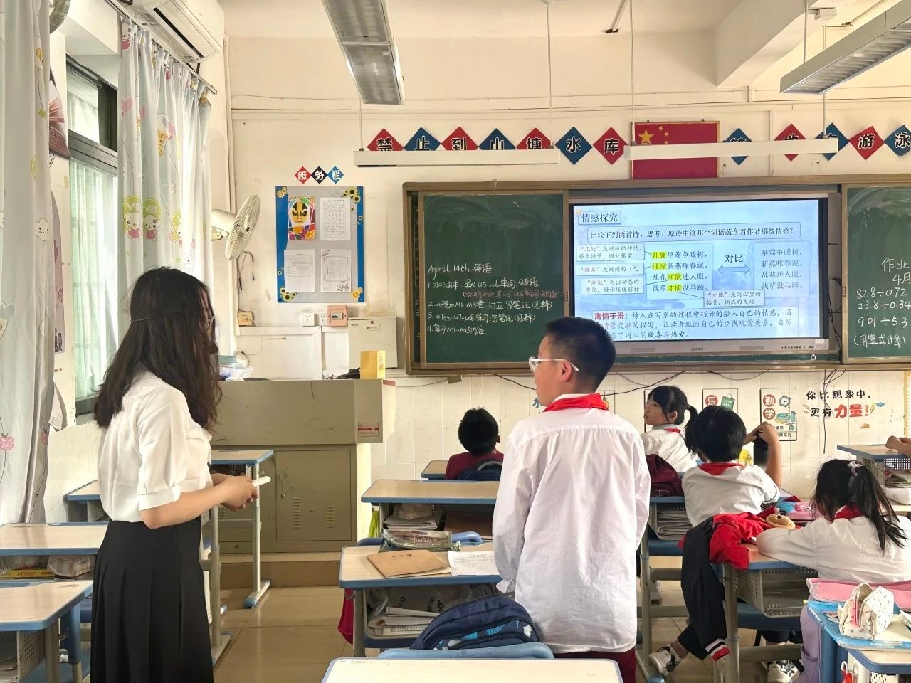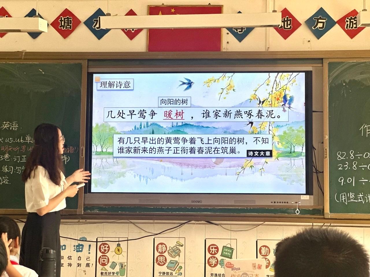 在研读环节,小武老师通过移步换景的讲解方式解析字词含义与诗句大意:微风和煦的春日里,白居易骑马游西湖,途经孤山寺北面至贾亭西侧,目睹春潮初涨与堤岸齐平,云层低垂与水天相接。正当他沉醉于湖光山色时,清脆鸟鸣唤醒春意:早出的黄莺争栖向阳枝头,新来的燕子衔泥筑巢。同学们听着老师的描绘,聚精会神地想象着春意盎然的西湖风光,体会诗人流连忘返的心境。