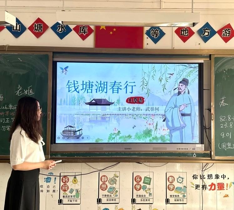大家好,我是来自2023级汉语言文学的武誉坷,非常荣幸能够有机会站在流溪小学的讲台上为同学们授课。这是我第一次进行古诗词课堂的授课,在这次的授课过程中,我学习收获了丰富的实践经验,认识到了自己很多需要改正的问题,对教师这份职业增添多了一份敬意。