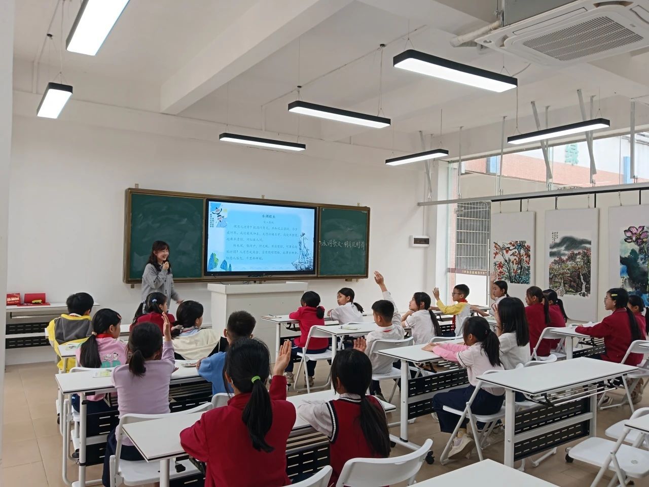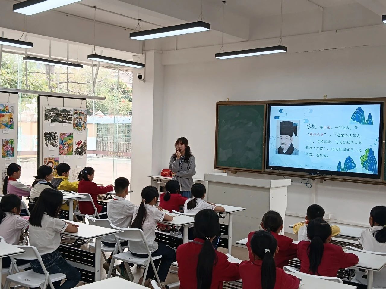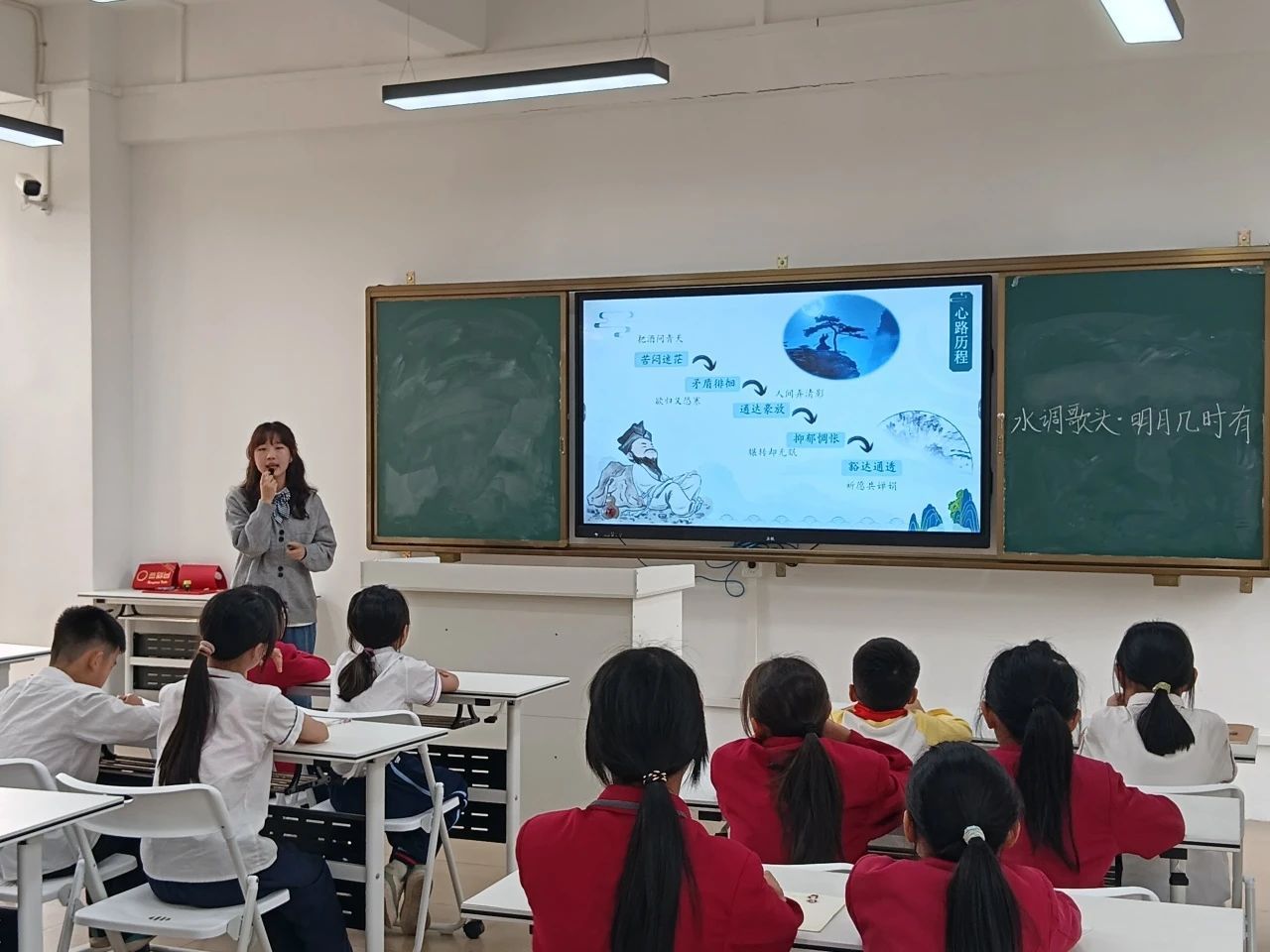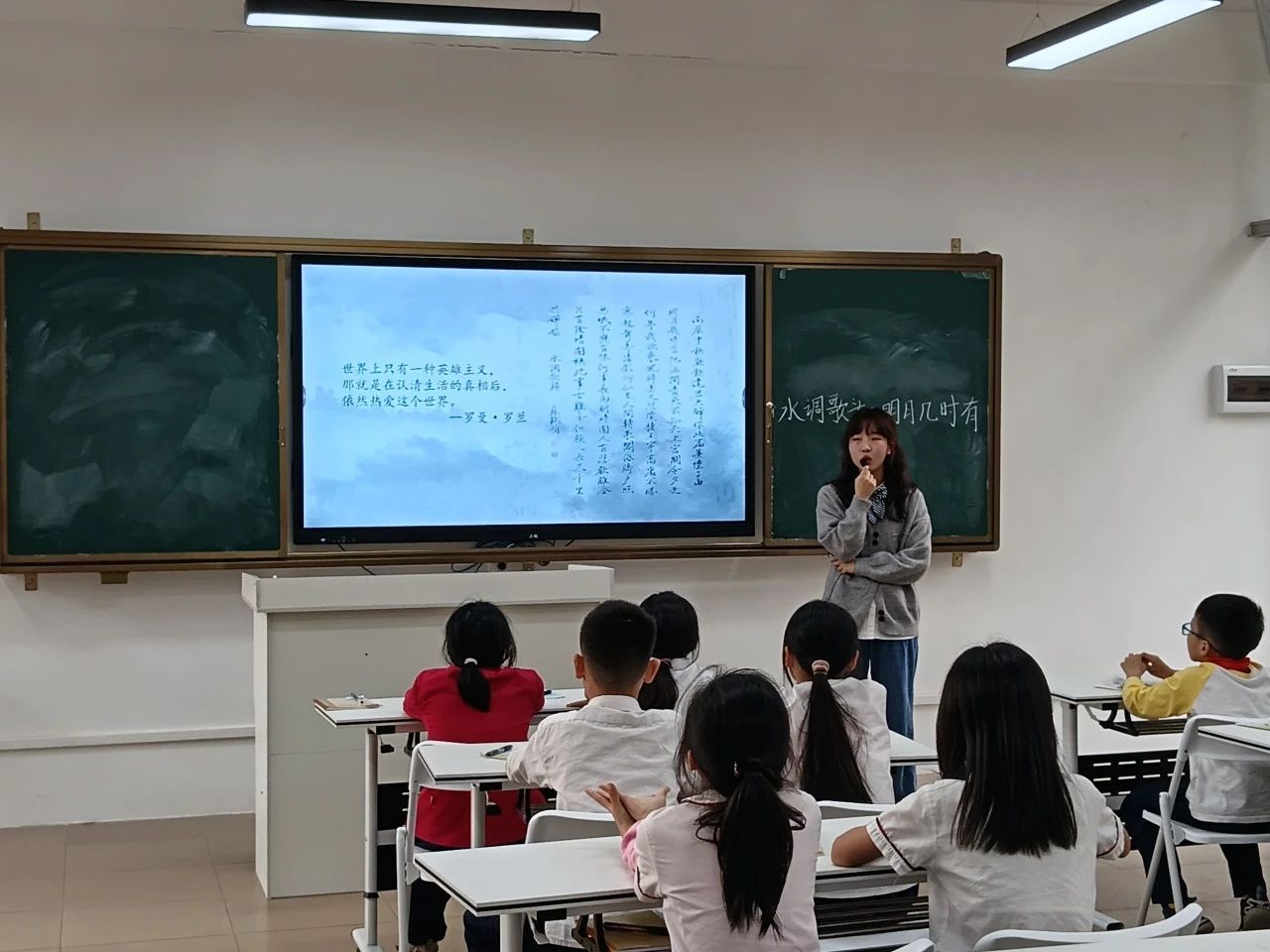 课堂尾声,小黄老师为同学们播放了以《水调歌头•明月几时有》改编的音乐。旋律响起时,孩子们再次不约而同的跟随旋律哼唱,古词新曲的碰撞,让经典焕发出新的生命力。最后,小黄老师以罗曼•罗兰的名句结尾——世界上只有一种英雄主义,就是在认清生活的真相后,依然热爱这个世界。她鼓励同学们在以后的人生中,无论面对怎样的困境,都能如同乐观的苏轼一样,坦然面对人生的挫折苦难,学会与自己和解,依然去热爱这个世界。