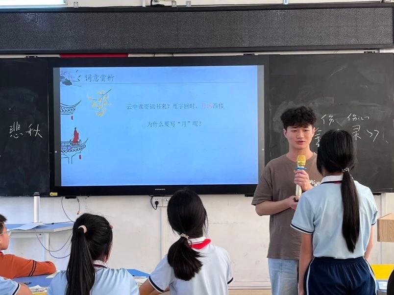 讲解上阕时,小莫老师指着“红藕香残玉簟秋”这一句,引导同学们展开想象:“这七个字勾勒出怎样的意境画面?”结合小莫老师给出的词意,同学们踊跃发言,各抒己见。随后,小莫老师颔首补充:“景中藏情,荷花谢幕,恰似青春易逝;竹席渐凉,暗喻人去楼空。”当讲解到“云中谁寄锦书来”时,小莫老师又抛出一个引人深思的问题:“词人期盼丈夫的书信,可古代没有手机,信件如何传递呢?”面对同学们疑惑的神情,他娓娓道来:“下句‘雁字回时,月满西楼’便是答案。这里化用了‘鸿雁传书’的典故,将南飞的大雁比作信使,通过典故的巧妙运用,含蓄地表达了词人对丈夫的深切思念。”这一番讲解让同学们恍然大悟,纷纷记录下这一重要的文学知识,课室里洋溢着浓厚的学习氛围。