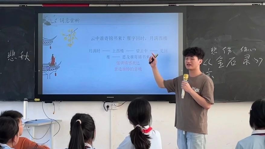 课程伊始,小莫老师精心准备了一段由李清照词作改编的音乐视频作为课堂导入,这段富有感染力的视频很快抓住同学们的注意力,大家纷纷沉浸在音乐的世界里。视频播放完毕,小莫老师自然而然地引出今天所要鉴赏的词作——《一剪梅·红藕香残玉簟秋》。随后,在互动环节,小莫老师通过提问的方式带领同学们回顾上一节课的内容。同学们积极举手,踊跃发言,向大家分享了他们对李清照的认知:作为婉约派代表词人,她与丈夫赵明诚的爱情故事令人称羡,特别是“赌书泼茶”的典故更是展现了这对才子佳人的情趣生活。而今天要学习的这首词,正是李清照与赵明诚分隔两地期间所作,字里行间流露出她对丈夫的浓浓相思之苦。