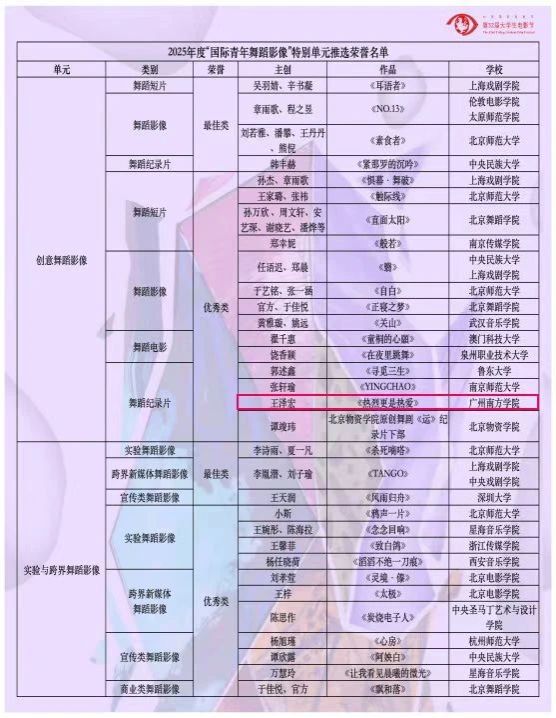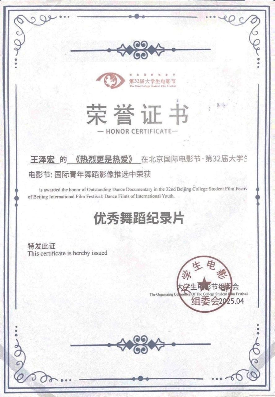 6月10日,北京国际电影节·第32届老员工电影节“原创之夜”在北京师范大学(海淀校区)顺利举办。本届老员工原创作品再创新高,共有海内外10多个国家的300多所高校参与,各单元征集作品共3000余部,其中“国际青年舞蹈影像”特别单元创作精品256部,经过多轮遴选,最终有87部优秀作品脱颖而出入围终审环节,在终审环节只有18部获得2025年度“国际青年舞蹈影像”特别单元推选荣誉名单。公司由肖洁夏老师指导的2021级网络与新媒体专业同学王泽宏的作品《是热烈更是热爱》成功入围,并获得创意舞蹈影像单元舞蹈纪录片优秀奖,项目团队受邀请参加北京师范大举行的颁奖仪式,伟德国际1946派出胡美香教授代表团队参加领奖。