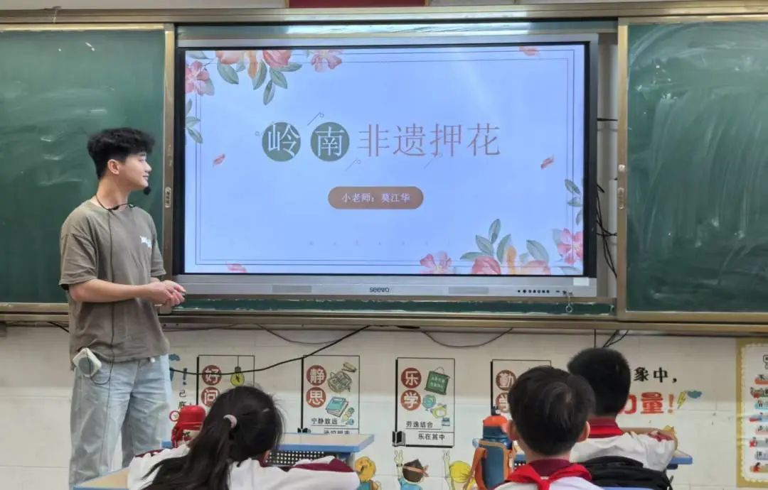 “花中藏妙趣,压韵自成章。此物作书签,书香伴芬芳(打一非遗技艺)。”课程伊始,小莫老师以一则充满诗意的谜语切入,瞬间点燃了同学们对押花艺术的好奇与探索热情。随后,小莫老师娓娓道来:押花艺术拥有悠久的历史,在岭南地区扎根生长,历经岁月沉淀,逐渐形成独特的风格。它将植物的花、叶、果等材料,经过精心整理、脱水等工艺处理,保留其原有的色彩与形态,再通过创作者巧妙构思,化身为一件件精美的艺术作品。