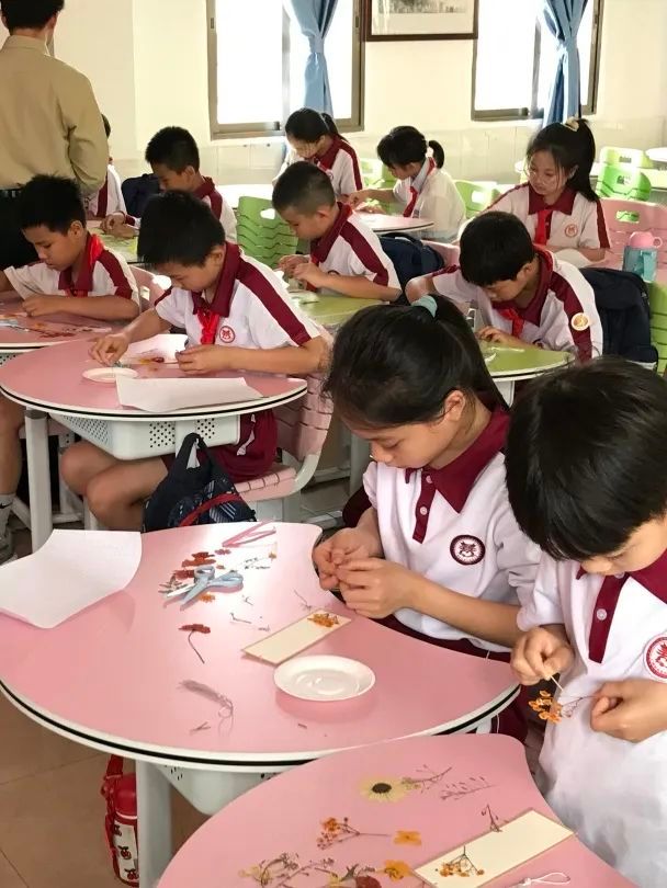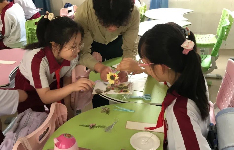"同学们还记得吗?把花草押贴在书签上的技艺,就是岭南非遗押花工艺。"课程伊始,小莫老师带着同学们回顾上节理论课讲的内容,重温押花的文化魅力。而今天这节课,大家将亲手制作属于自己的押花书签!老师话音未落,同学们便热烈讨论起书签的设计方案,本堂实践课在热烈的氛围中拉开帷幕。