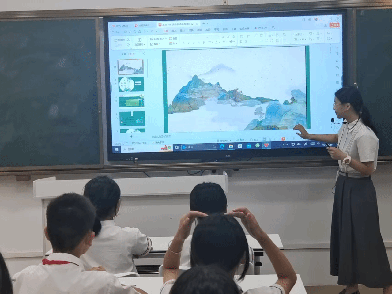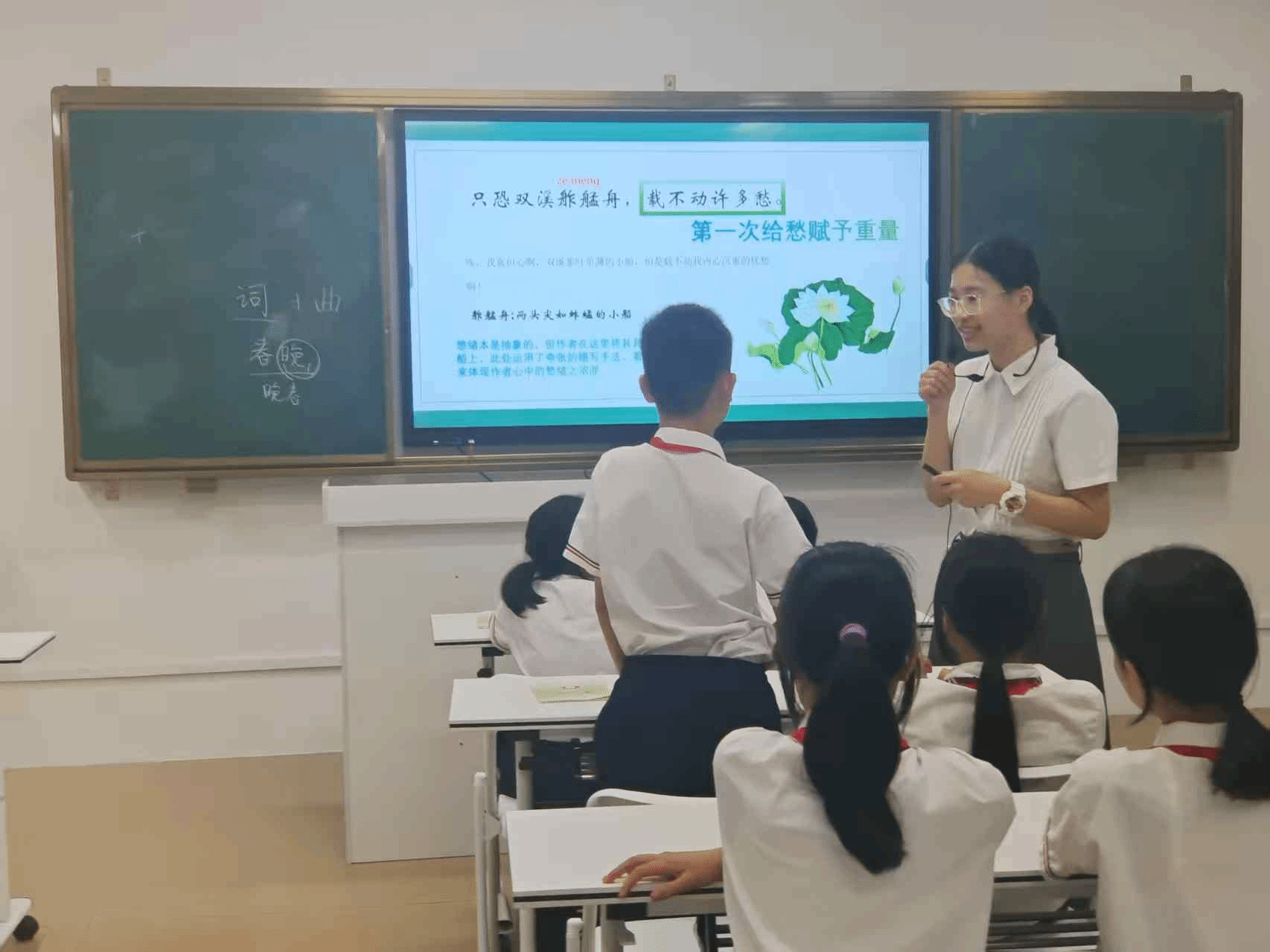 课堂伊始,小欧老师对同学们提出了一个问题:“同学们,你们学过或者了解过李清照的哪些诗呢?”同学们纷纷回答:《声声慢》、《夏日绝句》等等。紧接着,小欧老师播放《武陵春·春晚》这首词的视频。这段精美的视频深深地吸引了同学们的注意力,让他们对李清照的这首词产生了浓厚兴趣。视频结束后,小欧老师带领同学们一起朗诵,并提醒同学们注意停顿的地方,以此加深了同学们对这首词的印象。