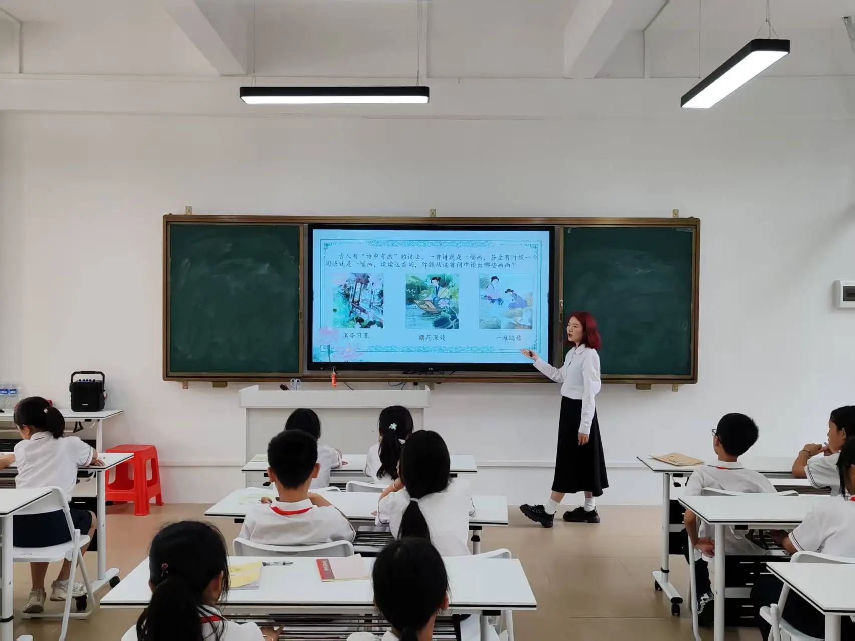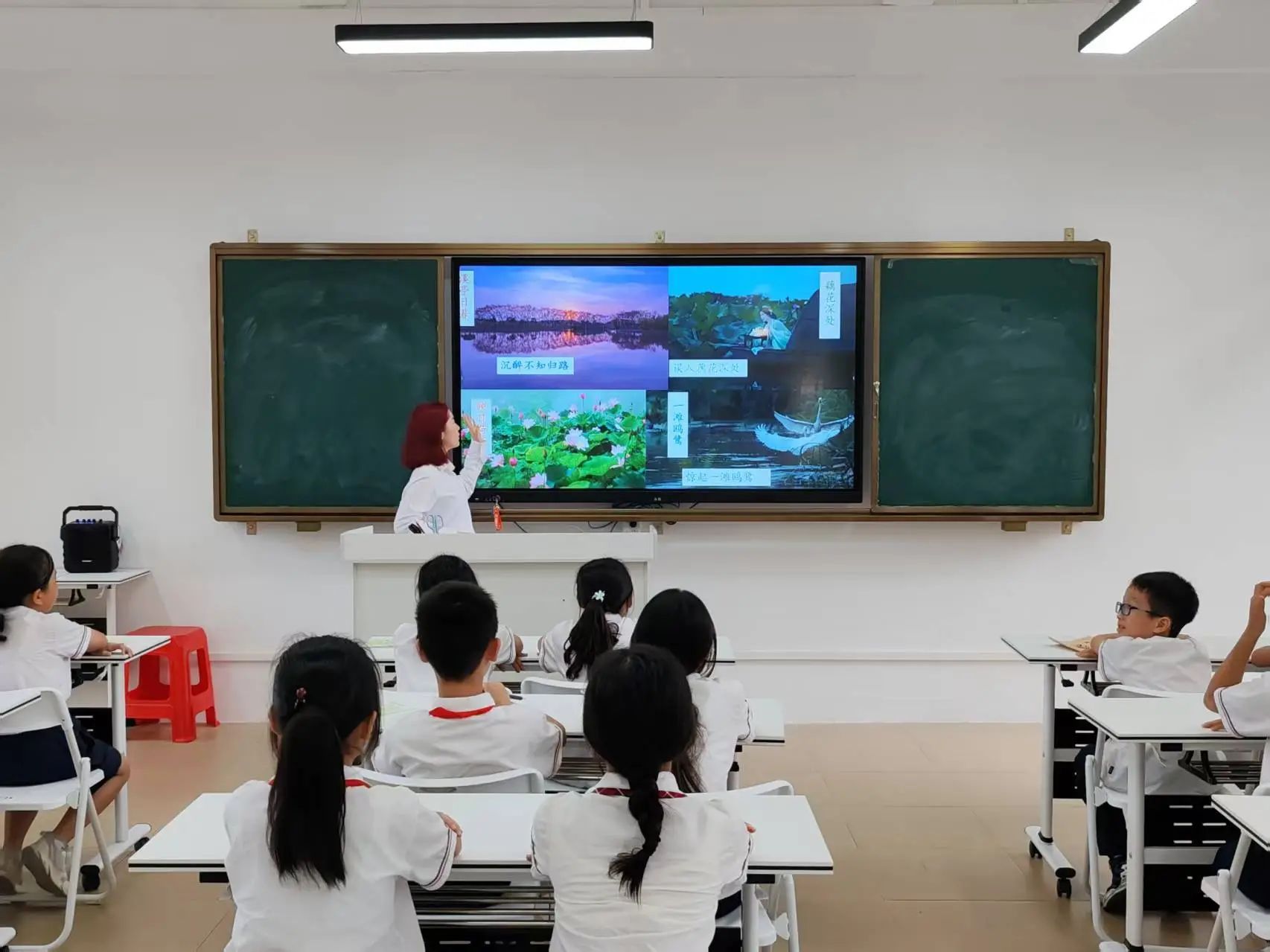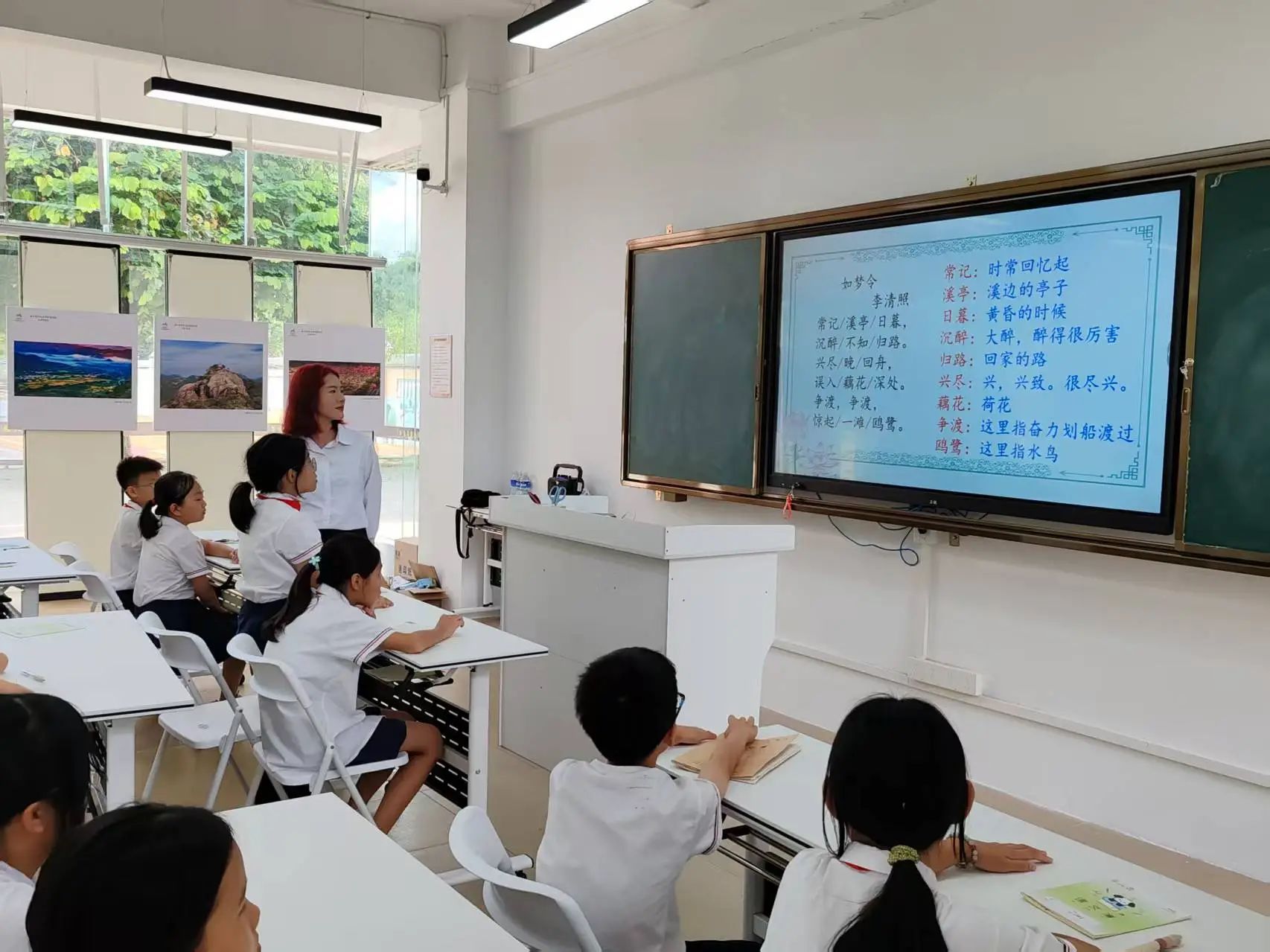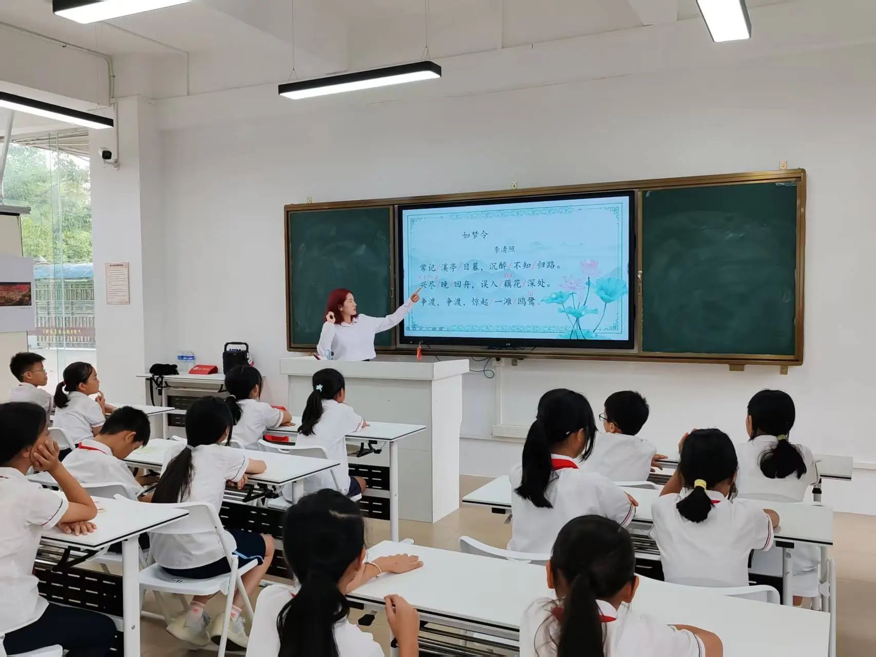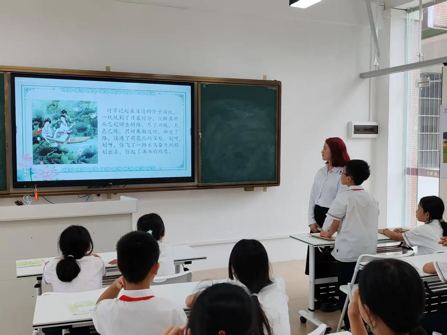 “常记溪亭日暮,沉醉不知归路……”小温老师用柔和而富有感染力的声音带领孩子们朗读《如梦令》。在她的引导下,孩子们的朗读声越来越整齐,也越来越有感情。在个人朗读环节,一双双小手争先恐后地举起,每个孩子都渴望用自己稚嫩却真挚的声音诠释这首词作。在小温老师的鼓励下,孩子们在抑扬顿挫的朗读中逐渐领悟到诗词的节奏与情感,感受到这首词的韵律之美。