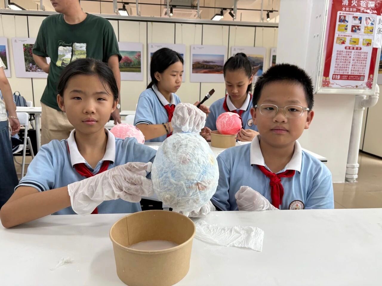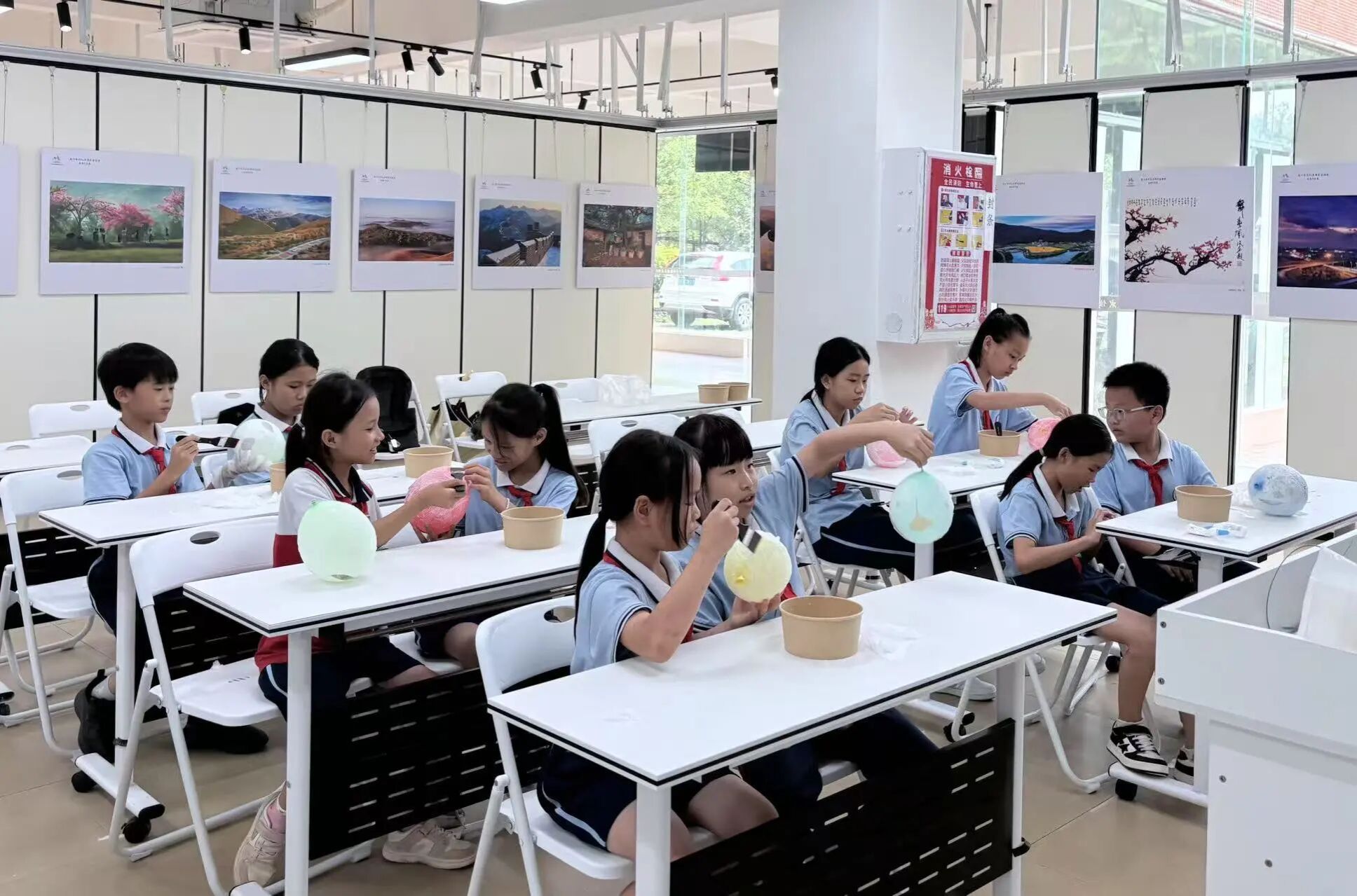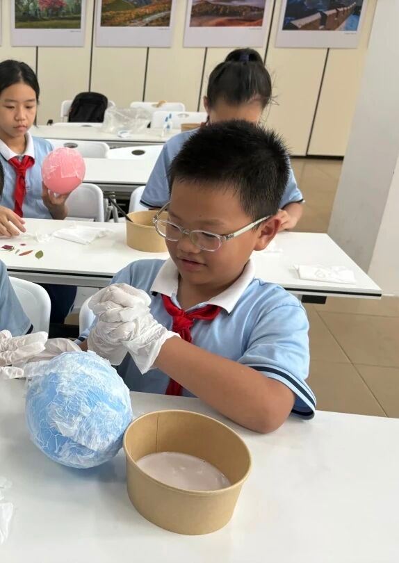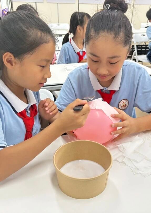 终于到了同学们最期待的时刻—亲手制作属于自己的花草纸灯笼。同学们将气球吹出喜欢的大小,再用胶水将纸抹在气球表面,最后用叶子、假花装饰。教室里洋溢着创作的喜悦,当轻柔的纸与花草小心翼翼地被覆盖、粘贴在气球上,整个过程仿佛是与古老智慧的温柔对话。随着灯笼雏形渐显,一件件融合了个人巧思与自然之美的独特艺术品在孩子们手中诞生。