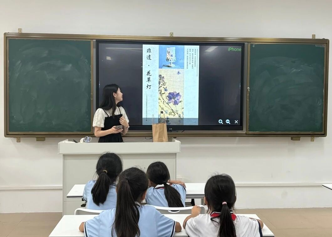 课堂接近尾声,同学们兴奋地举起灯笼像小龙老师展示自己的艺术品,通过亲手触摸、塑造,同学们对花草纸这项非遗技艺的魅力有了更深的体悟。小小的灯笼,不仅照亮了教室,更映照出传统工艺的灵动之美。伴随着欢乐的笑声和满足的笑脸,本次非遗课程在孩子们手捧灯笼的温暖光影中圆满结束。