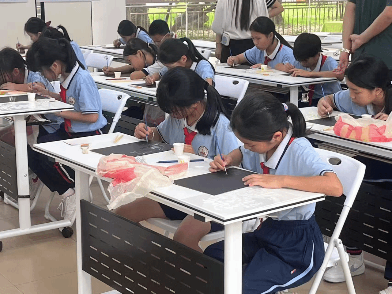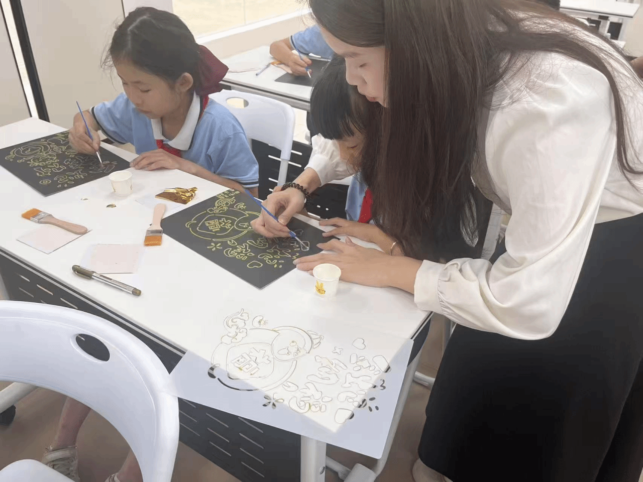 在实践课堂,梁育嫦老师首先给同学们回顾了金箔的制作步骤,在小助手的帮助下,同学们开始了期待许久的实践环节。同学们手持黑色卡纸,屏息凝神,用铅笔勾画轮廓,再用胶水描边,然后将箔片贴在画纸上,最后用刷子轻轻扫去多余的箔片。教室里洋溢着创作的喜悦,金箔翻动间,仿佛无数个小小的艺术世界在阳光下熠熠生辉。