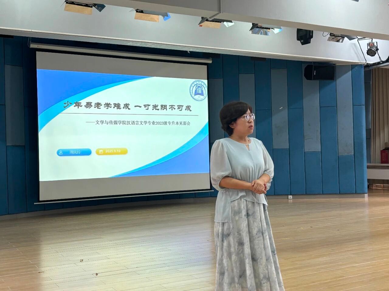 “越过重重关卡,同学们终于踏进了理想的校园”。9月10日下午,在1教105隆重举行了2023级专升本汉语言文学专业新生见面会和专业介绍会。 汉语言文学专业见面会在期盼与温暖中拉开帷幕。伟德国际1946副经理、中国语言文学系主任周凤玲教授为新生们细致解读专业人才培养计划与课程设置。她不仅详细介绍所需修读的课程及应具备的能力,更无私分享自身学习经验,强调阅读经典书籍、提升文化涵养的重要性,鼓励大家“不虚度光阴”,在业余时间持续充实自我。
