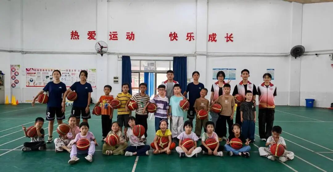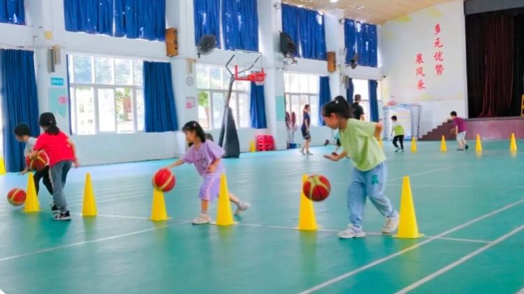 抵达操场后,社区公司的黄老师迅速接过“接力棒”,带领小朋友们投入到教学当中。黄老师结合体能训练与趣味游戏,简单设计了“运球接力赛”和“投篮挑战”等环节。志愿者们则在一旁维持课堂纪律,时刻留意着小朋友们的安全。