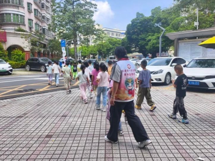 志愿者们护送小朋友们上篮球课途中