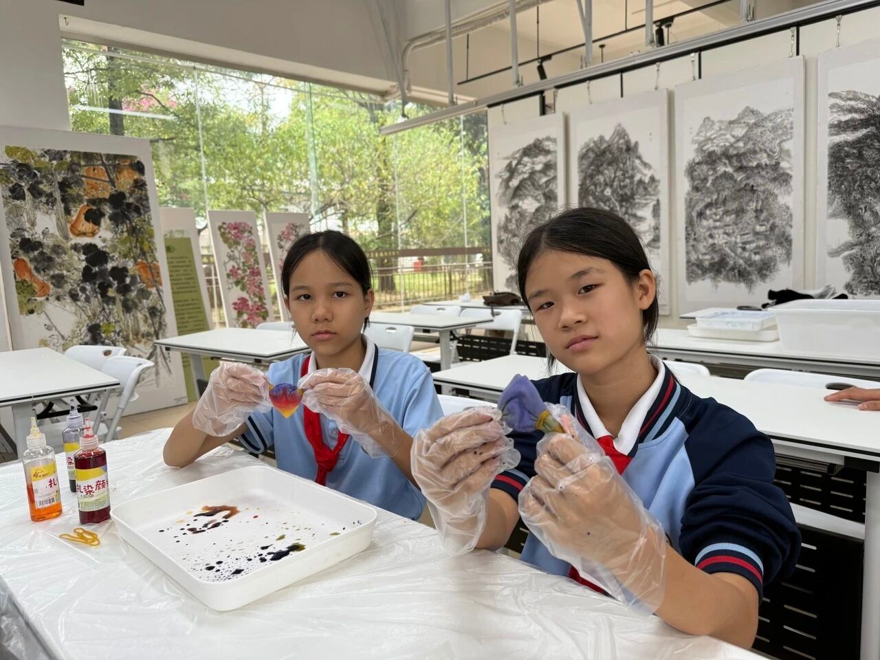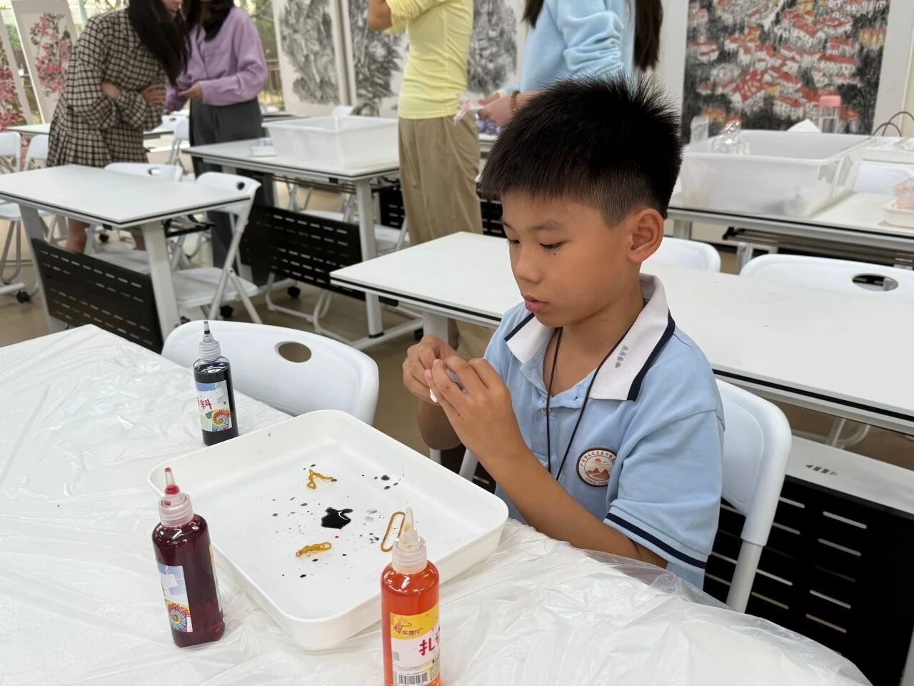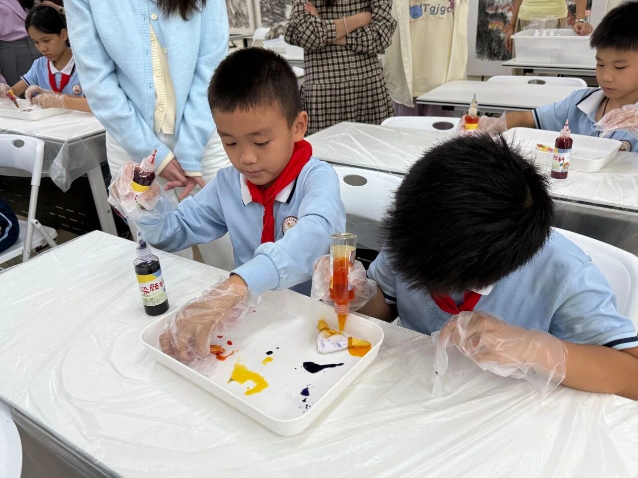 准备工作完成后,小卢老师指导大家按照由深到浅的顺序滴加多种染料。同学们充分发挥想象力,尝试着不同的染法与色彩组合。染料在布面上悄然渗透、相互交融,渲染出独一无二的奇妙图案:有的呈现出和谐自然的红黄渐变,有的展现出绚丽夺目的红蓝对比,还有的大胆融合了三种颜色,形成了层次丰富的视觉效果。