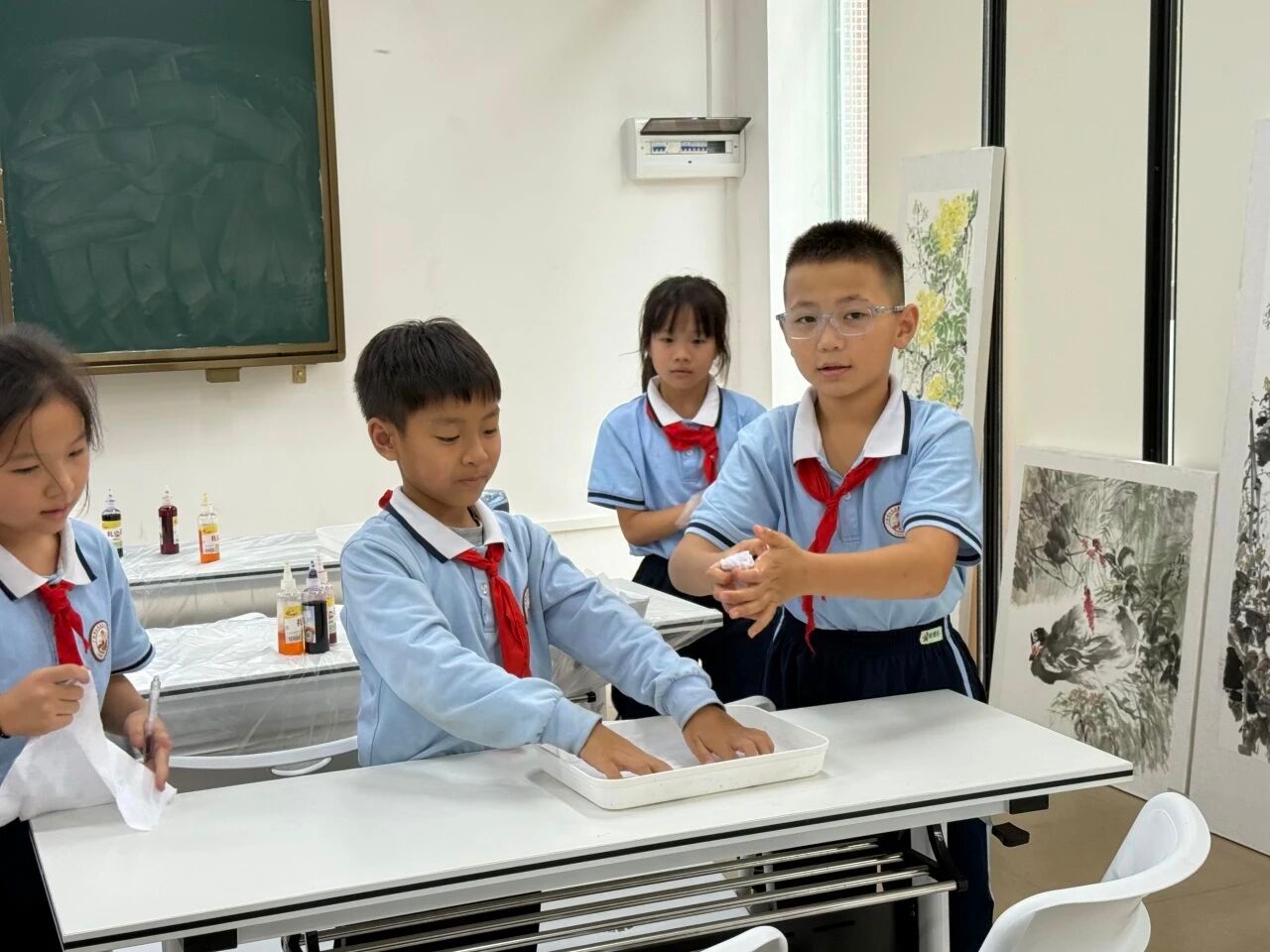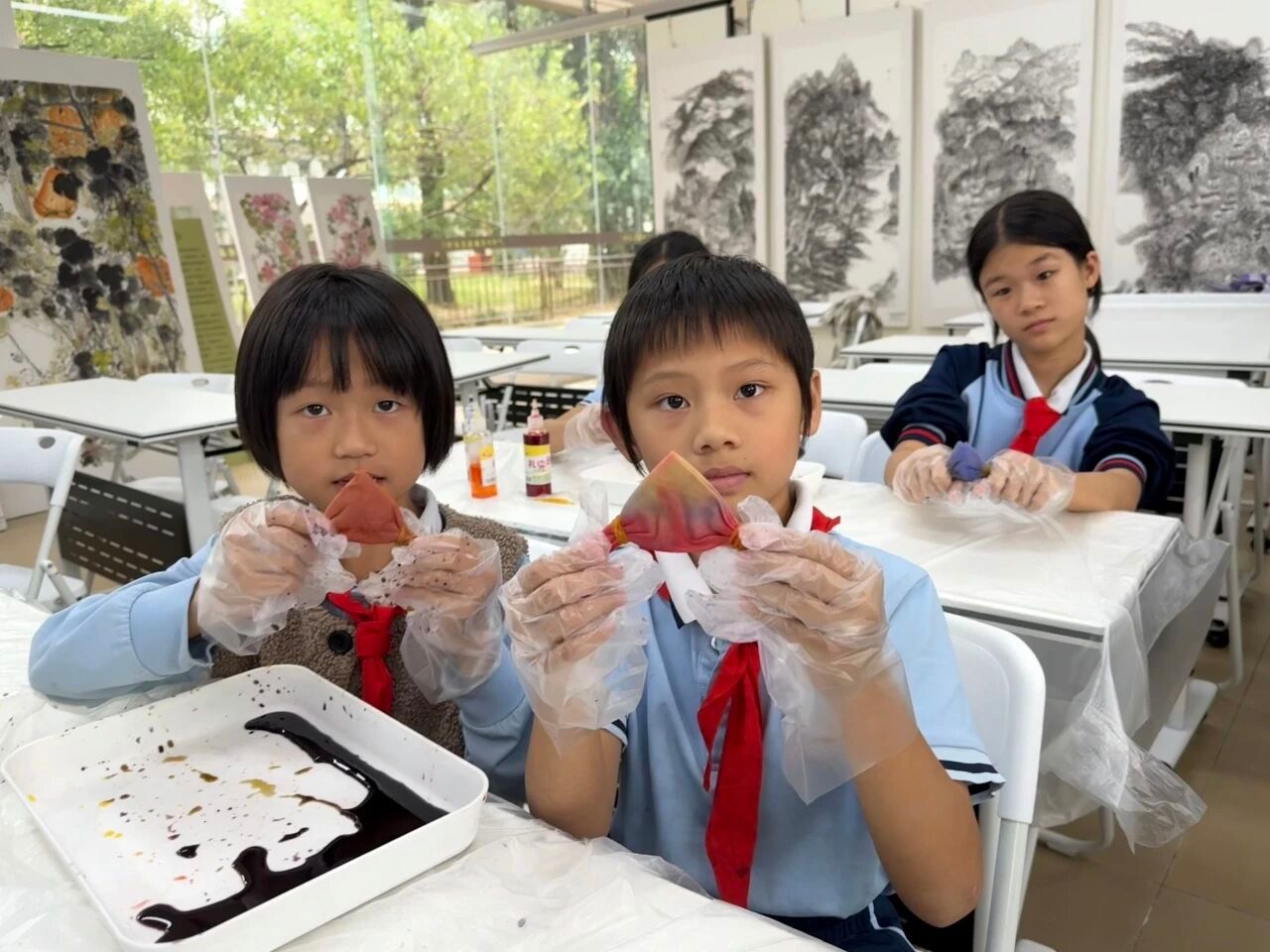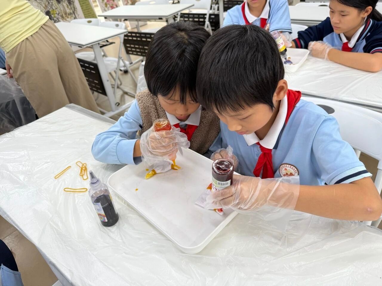 准备工作完成后,小卢老师指导大家按照由深到浅的顺序滴加多种染料。同学们充分发挥想象力,尝试着不同的染法与色彩组合。染料在布面上悄然渗透、相互交融,渲染出独一无二的奇妙图案:有的呈现出和谐自然的红黄渐变,有的展现出绚丽夺目的红蓝对比,还有的大胆融合了三种颜色,形成了层次丰富的视觉效果。