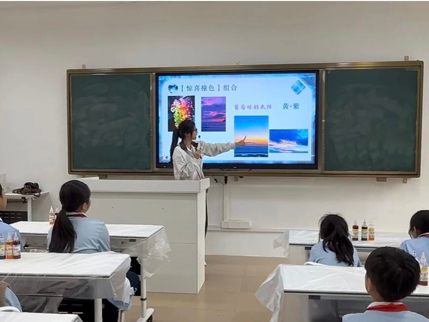 紧接着,小卢老师运用生动形象的比喻,讲解了“友好色组合”与“惊喜撞色组合”,这两类核心的色彩搭配技巧。她将经典的红粉组合比喻为香甜的“草莓牛奶”,指出邻近色的搭配和谐悦目,是新手入门的“友好搭配”;而醒目大胆的黄紫撞色,则被巧妙地联想为“紫色的葡萄”与“黄色的太阳”,创造出令人眼前一亮的“葡萄味的太阳”,让同学们轻松理解了对比色搭配的原理和创新趣味。