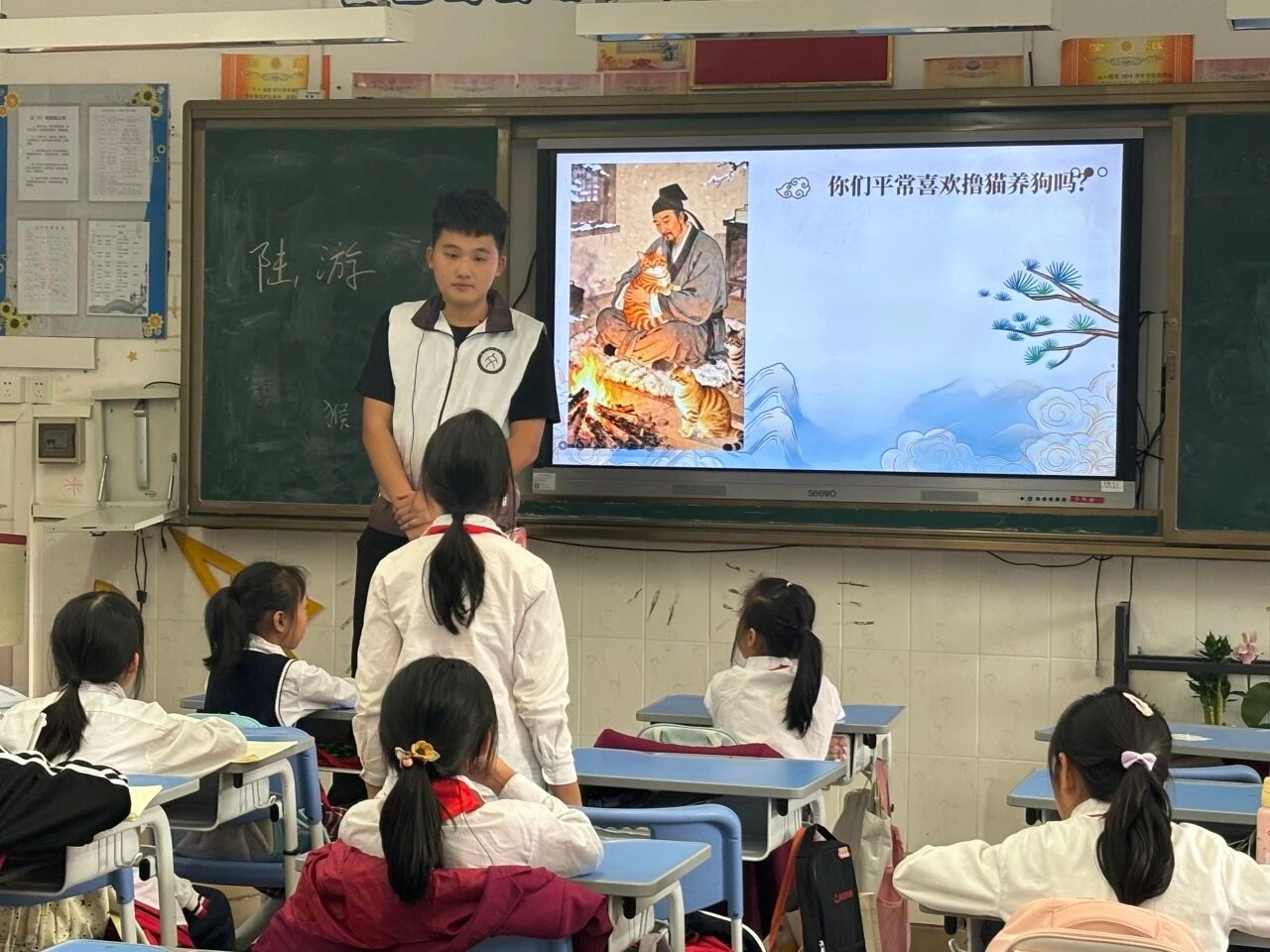 随后,小宋老师简要介绍了陆游的生平,并播放了一段关于“猫奴陆游”的趣味视频。看着古代诗人与小猫相处的故事,他顺势提问:“大家在家里都喜欢养什么小动物呀?”一时间,孩子们纷纷举手,争相分享自己与宠物之间的趣事,课堂里洋溢着欢声笑语。