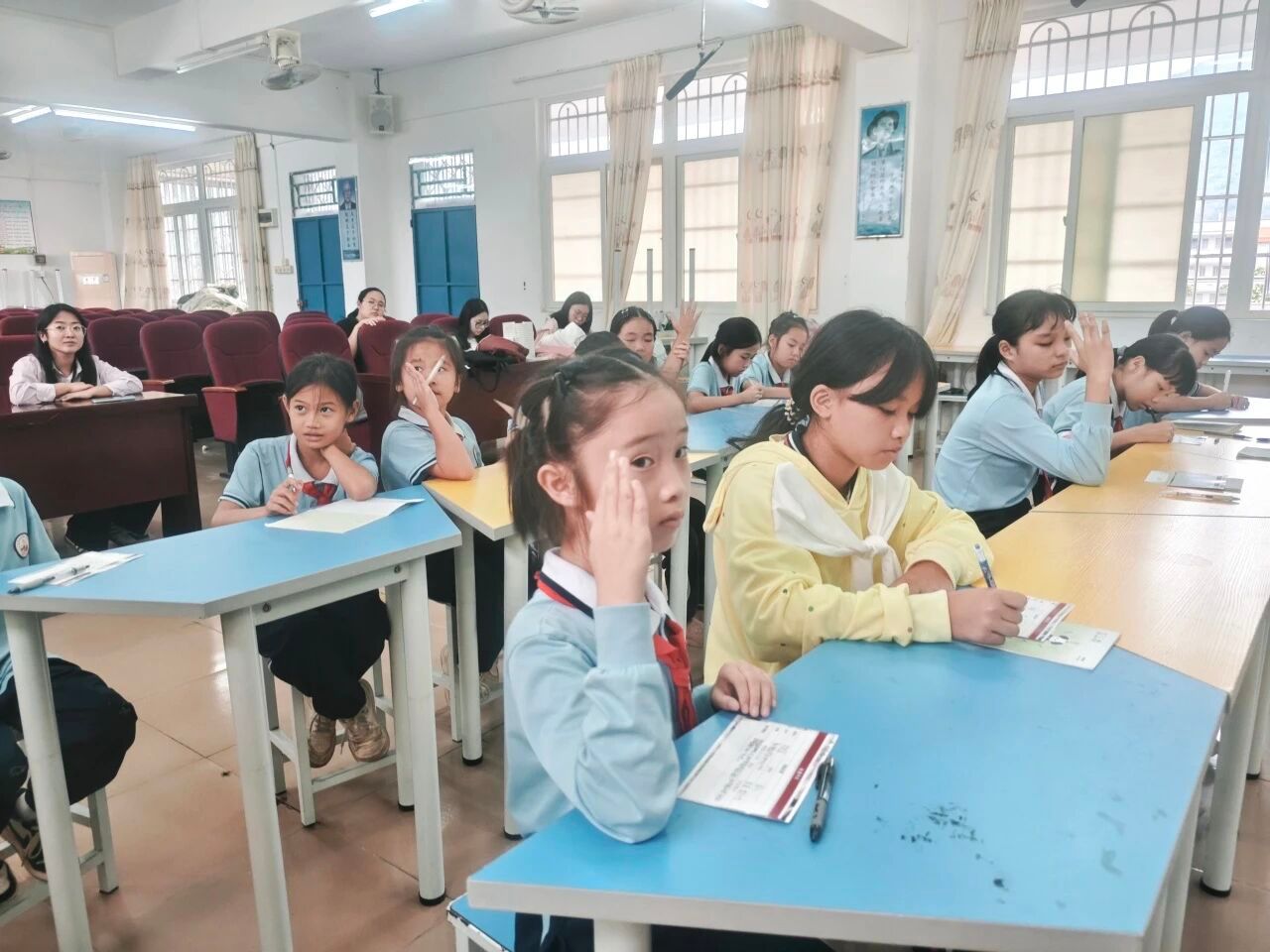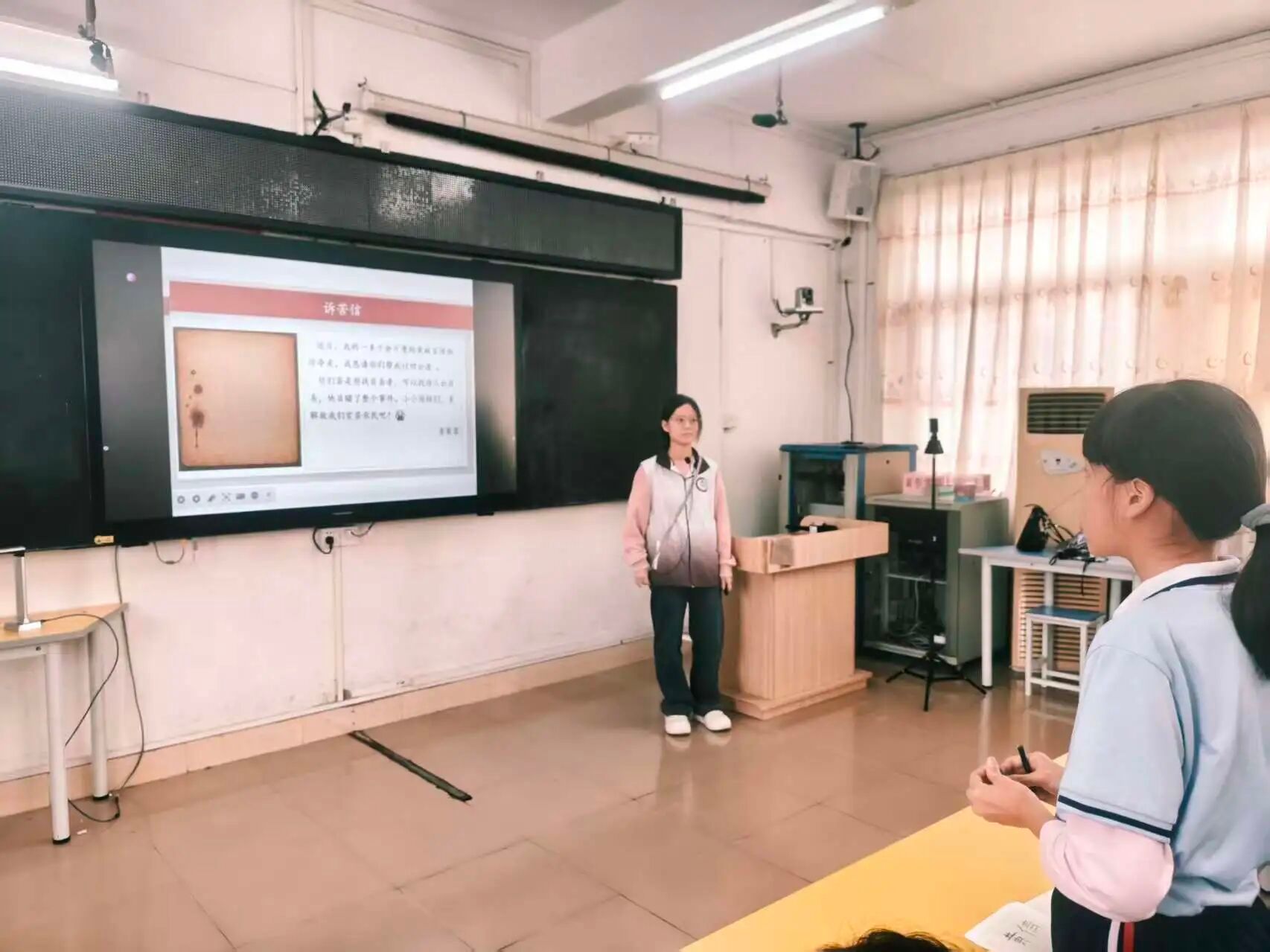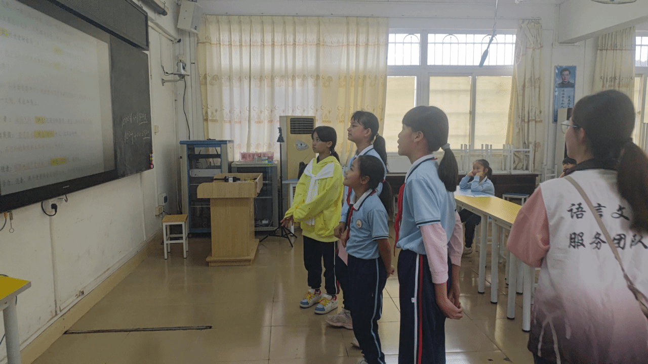 随后小胡老师又引导同学们进行情景演绎并思考使者是怎样的人,让大家对这首诗有了更深刻的认识,小胡老师告诉同学们读这首诗,不仅是读一个老人的故事,更是读一份对劳动者的关怀,一份对公平正义的追求。”