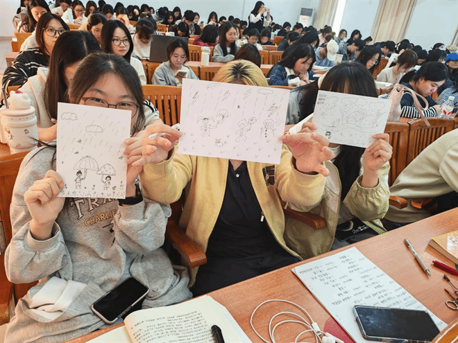 在“情绪觉察与表达”环节,鲁老师邀请同学们绘制“雨中之人”,通过画作分析个人的压力来源与应对资源。他还结合马加爵、林森浩等真实案例,警示长期压抑情绪可能带来的极端后果,并强调:抑制情绪会增加患病风险,而坦诚表达能有效降低焦虑,促进内心与人际和谐。
