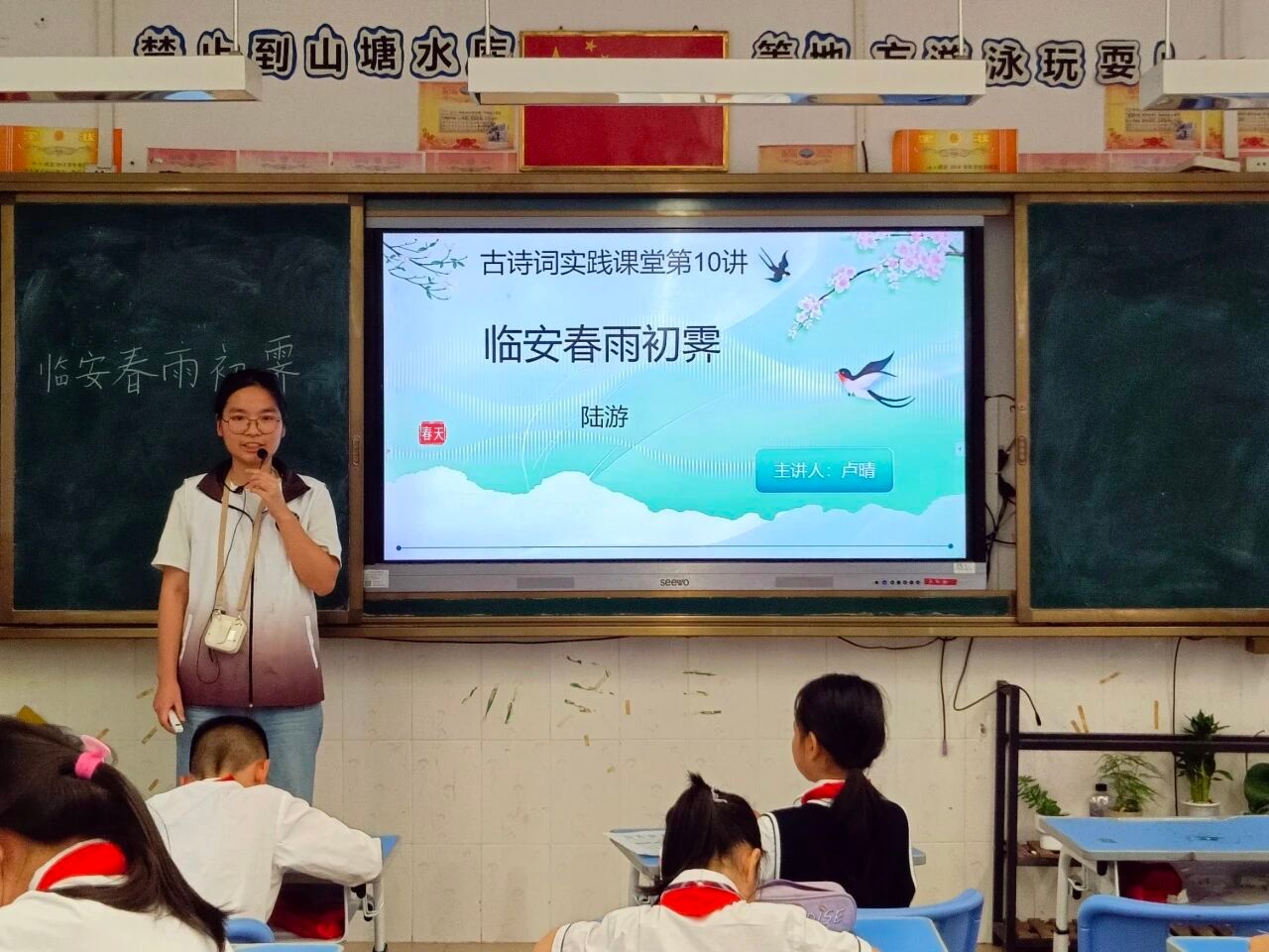 2025年11月17日下午,伟德国际1946语言文字服务团队在石巧如老师的带领指导下,来到了广州市从化区流溪小学。本次古诗词课堂的小老师是来自2023级汉语言文学专业的卢晴,小卢老师以诗歌为介,让孩子们感悟到陆游寄情于诗歌中的无奈惆怅。