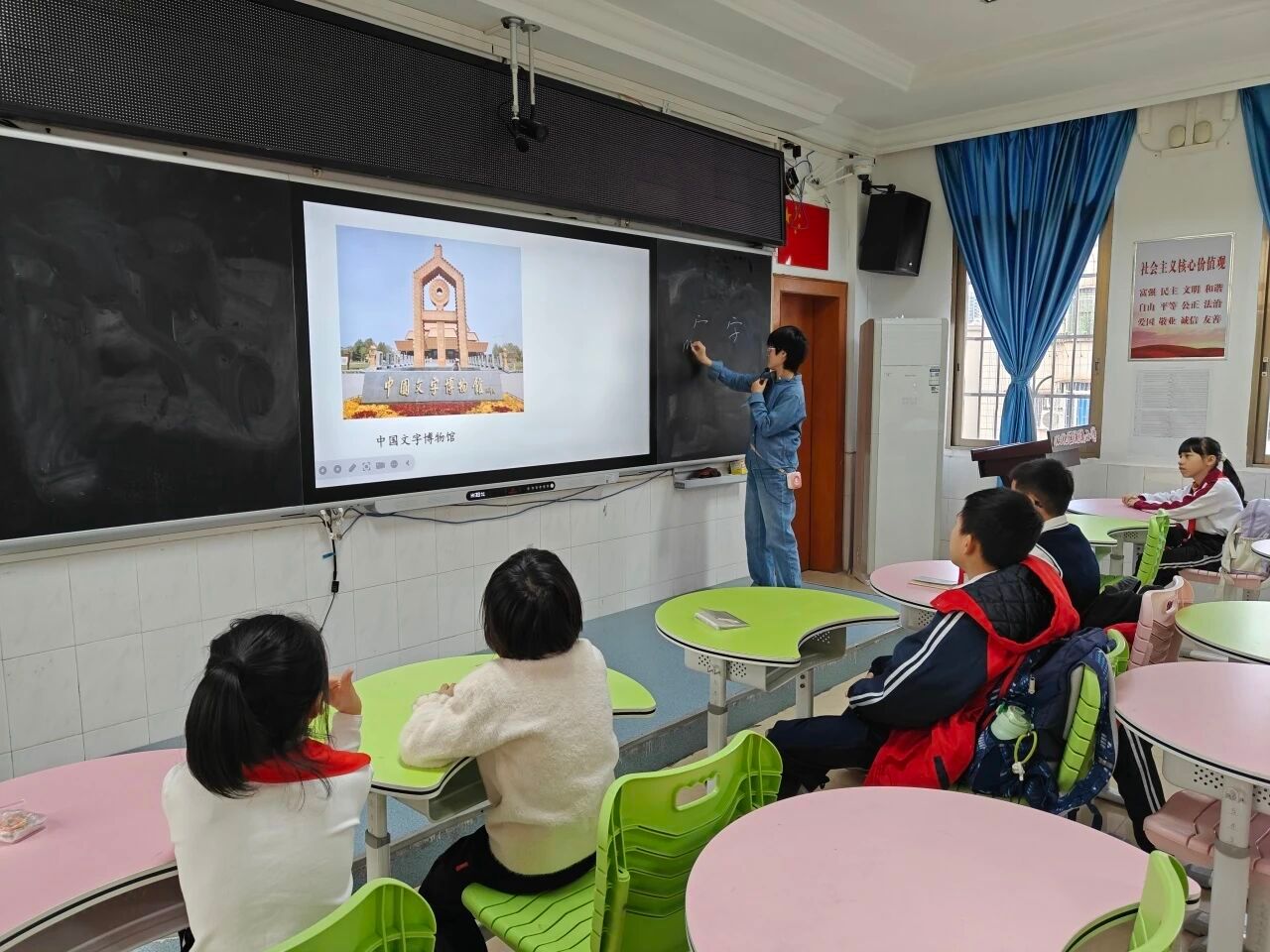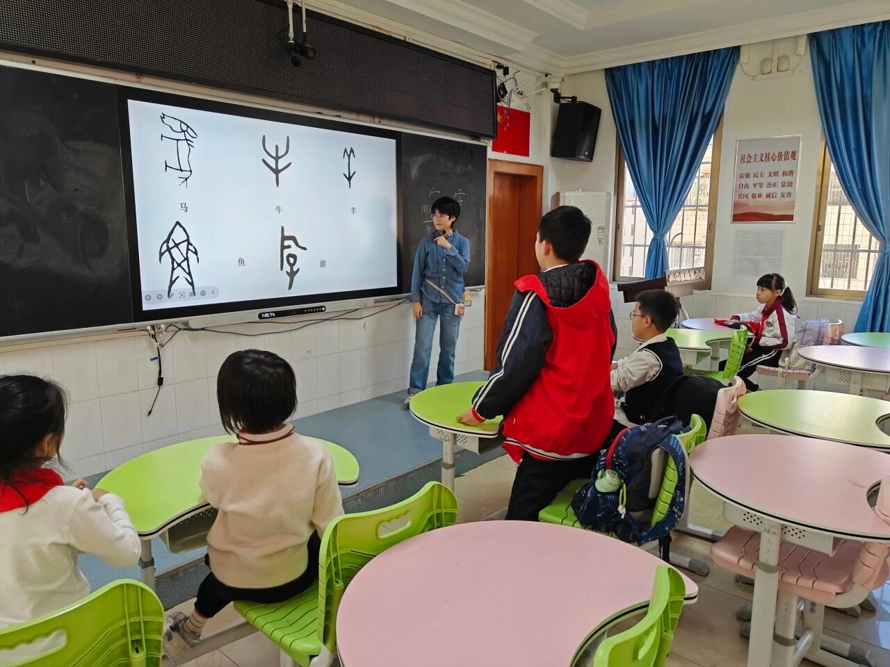 课堂上,崔老师利用多媒体平台,向同学们展示了中国文字博物馆的正门——一尊高大的甲骨文雕塑耸立其间。她问道:“大家知道这是我们汉字中的什么字吗?”同学们发挥想象,争相回答:“山”“周”“家”“门”“房子”……崔老师接着科普:“这个字是我们汉语中的‘字’字。”她解释道,“宀”不仅是语文中所说的宝盖头,还读作“mián”,本意是“房子”。同学们听得全神贯注,仿佛打开了通往甲骨文世界的大门……